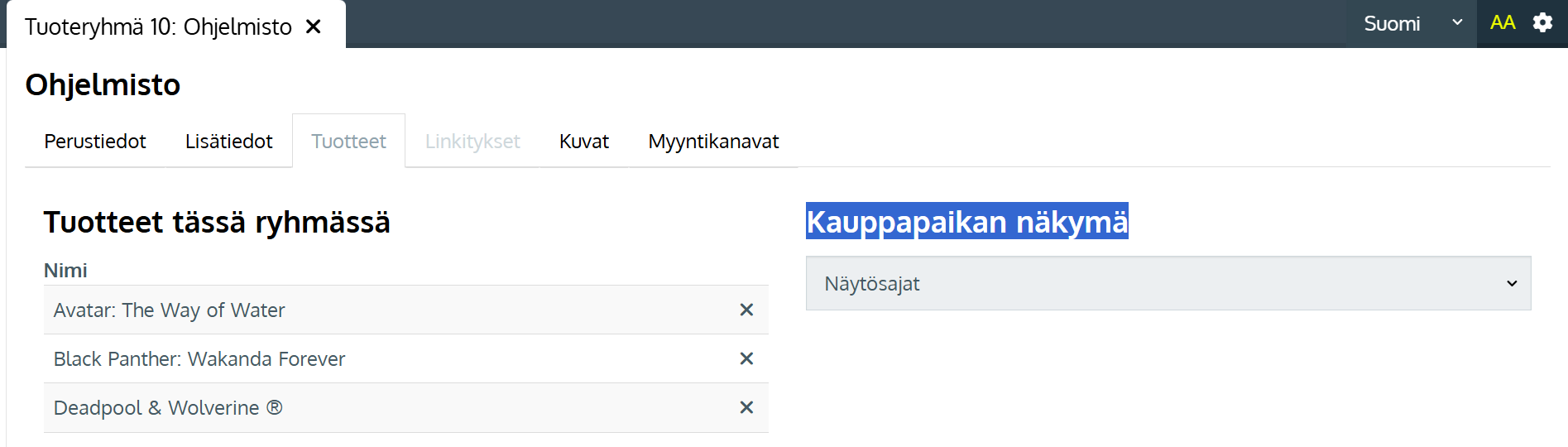 Verkkokaupassa näytökset tuodaan esille Johkuun luodulla tuoteryhmällä jolle on valittuna Kauppapaikan näkymä -asetukseksi Näytösajat.