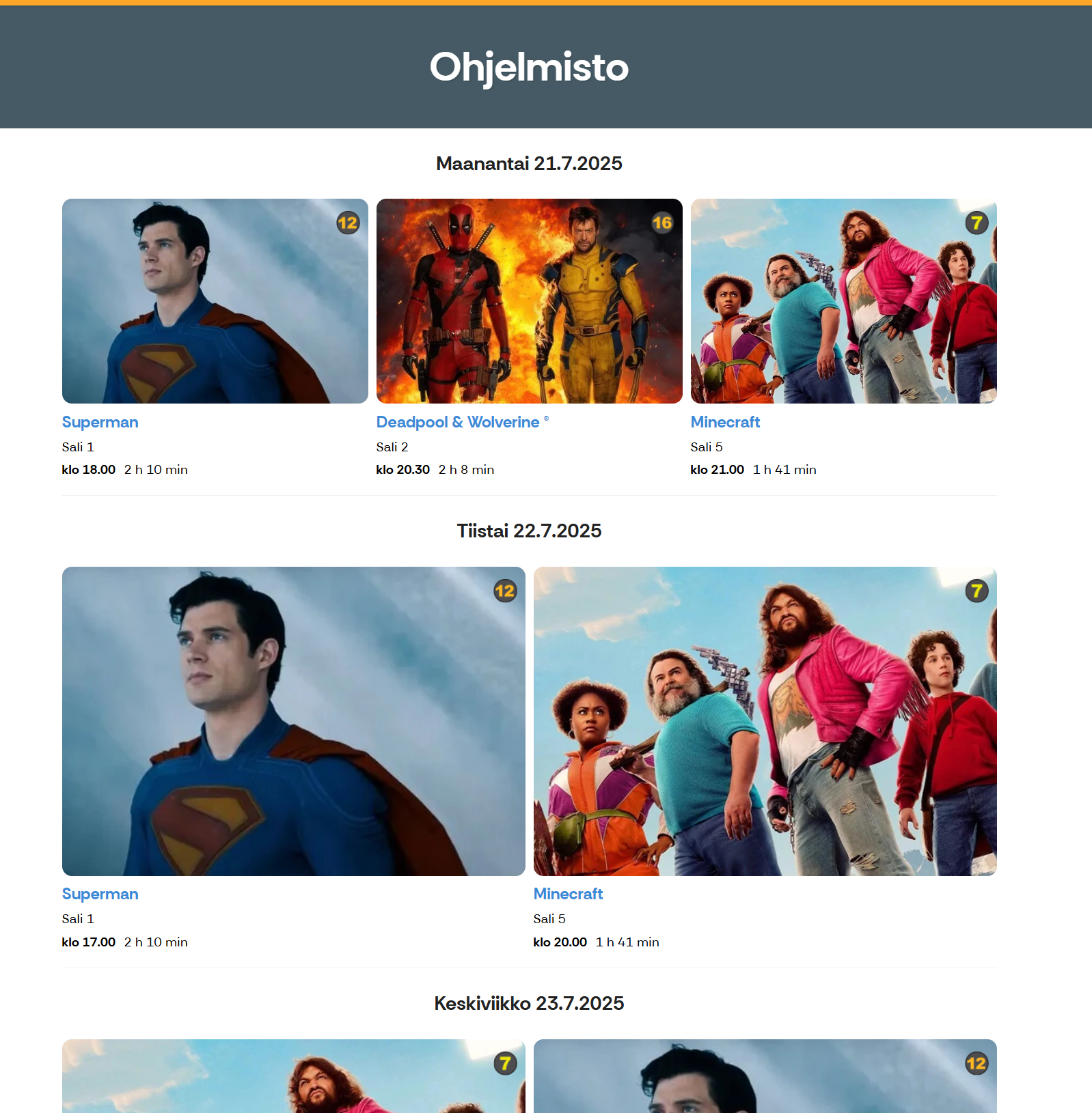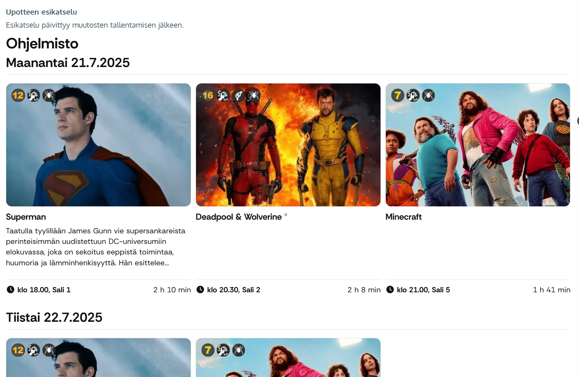 Tällä asetuksella kaikkien tähän tuoteryhmään lisättyjen elokuvien tai muiden tapahtuma-tyypin tuotteiden näytökset tuodaan automaattisesti esille päivämäärittäin: