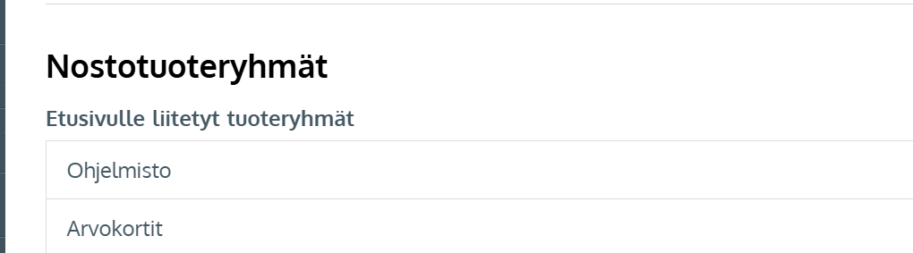 - Lisää tuoteryhmä kauppapaikan etusivulle Nostotuoteryhmäksi Etusivun nostotuoteryhmät, Kauppapaikan asetuksissa