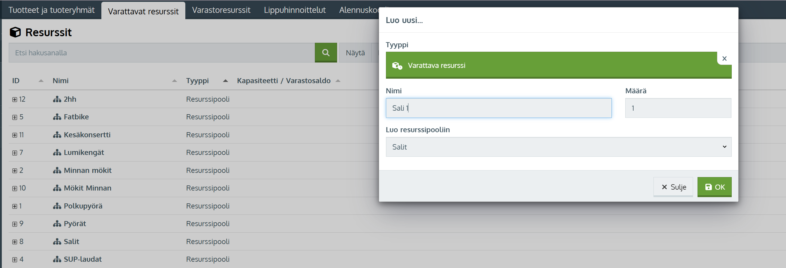 - Valitse resurssin tyypiksi Varattava resurssi ja määräksi 1 (sali) Resurssin luominen