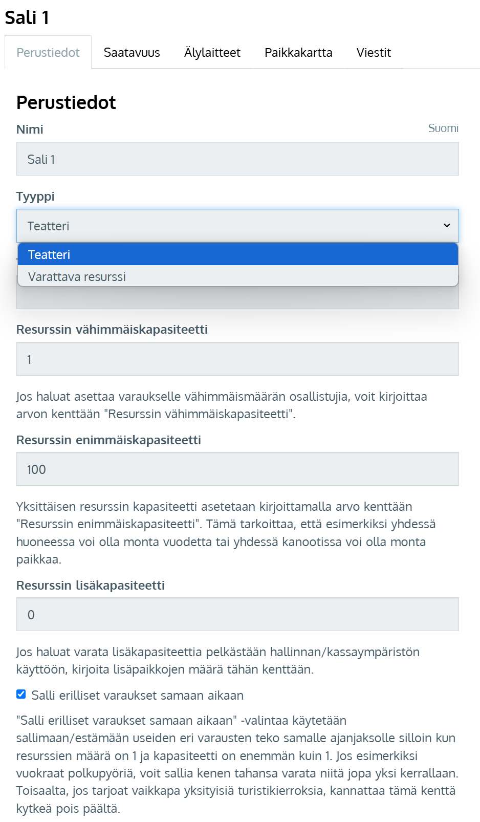 - Aseta Resurssin enimmäiskapasiteetti -kohtaan salin paikkamäärä. Jätä muut kapasiteettiasetukset muuttamatta