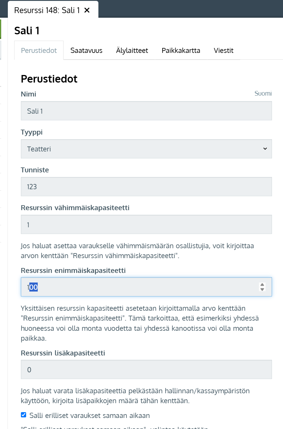 Huomioi, että jos salissa on käytössä paikkakartta, resurssin enimmäiskapasiteetin muokkaus ei vaikuta siihen automaattisesti vaan sinun tulee tilata paikkakartan muokkaus Johku-tuelta. Muokkaus on maksullinen.