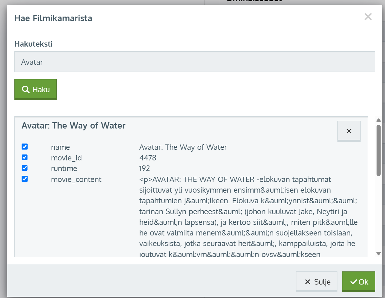 - Hakutulosriviä klikattaessa saat ikkunassa esille kaikki tietokannasta tuotavat tiedot elokuvasta