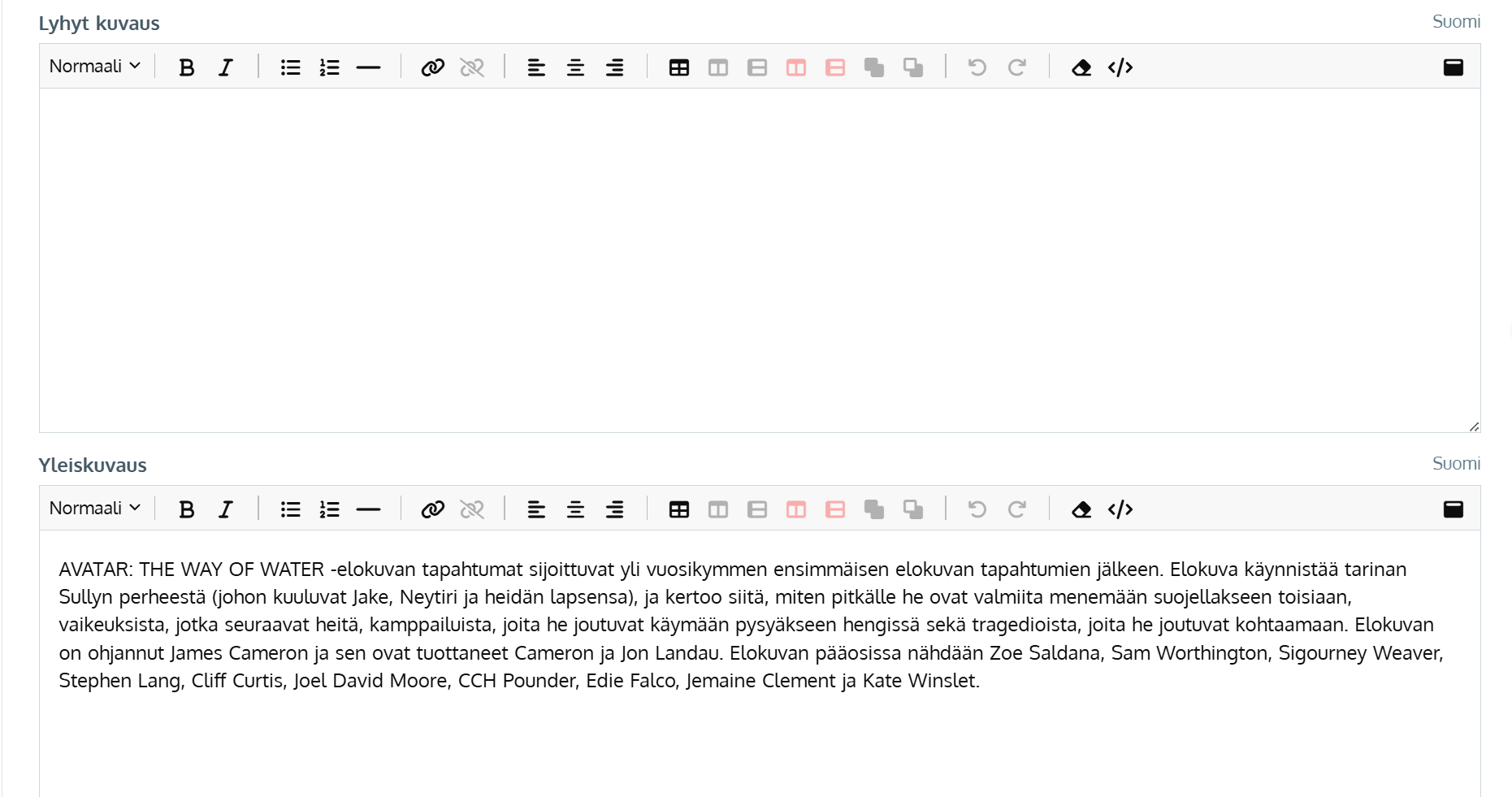 - Elokuvatietokannoissa ei ole Lyhyt kuvaus -kenttään haettavaa tekstiä. Täydennä Lyhyt kuvaus manuaalisesti tai kopioi Yleiskuvaus -tekstistä osa Lyhyt kuvaus-kohtaan. Tekstin maksimipituus on 200 merkkiä