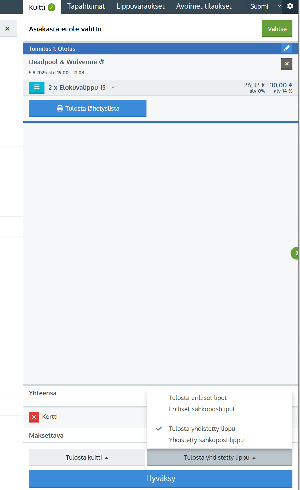 • Klikkaa näytöslistalta Lisää-nappia, jolloin saat yhden lipun Kuitti-sarakkeeseen