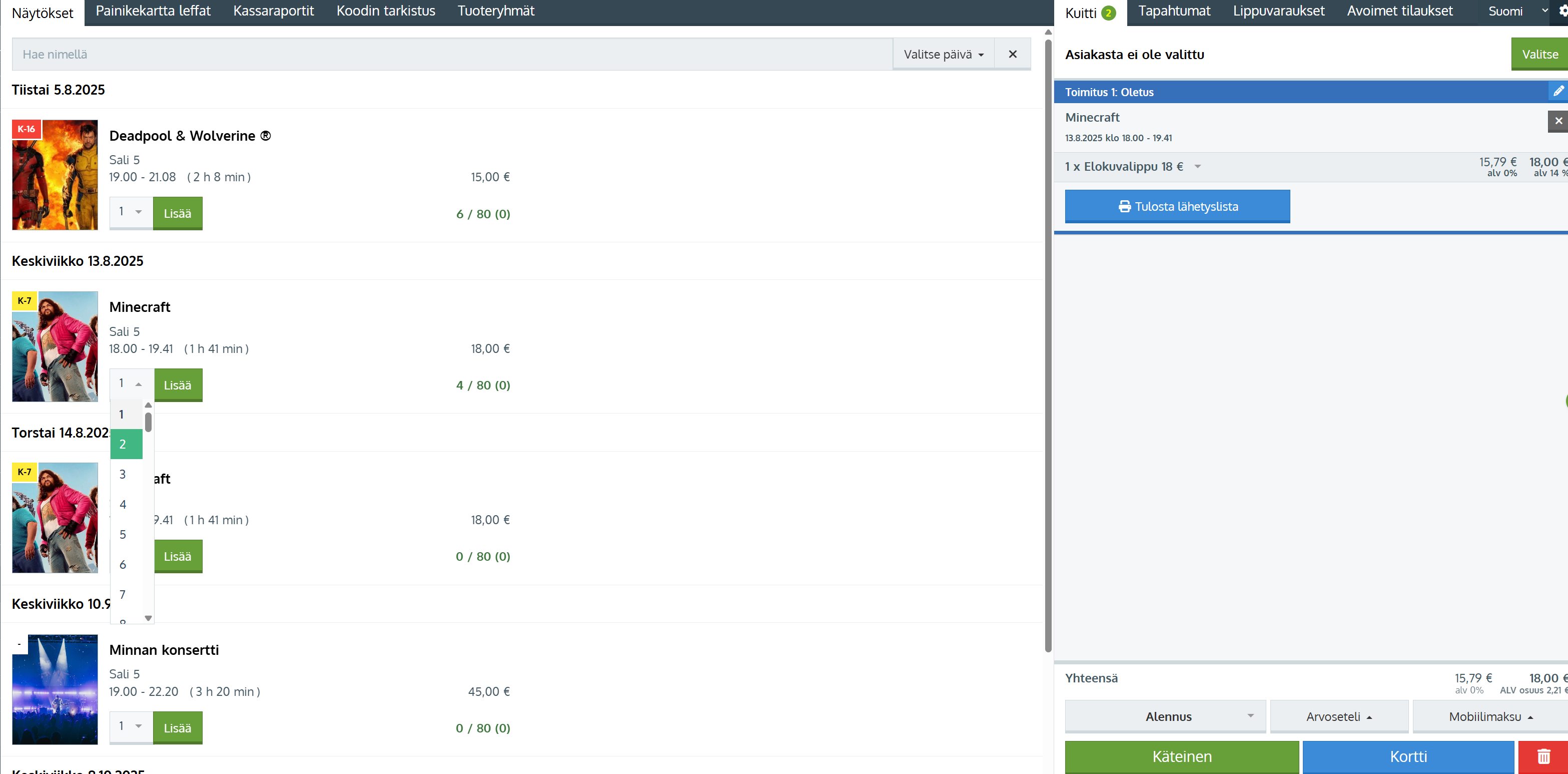 Elokuvien näytöslippujen myynti onnistuu kassakäyttöliittymän näytöslistalta Näytösten esilletuonti kassalla.