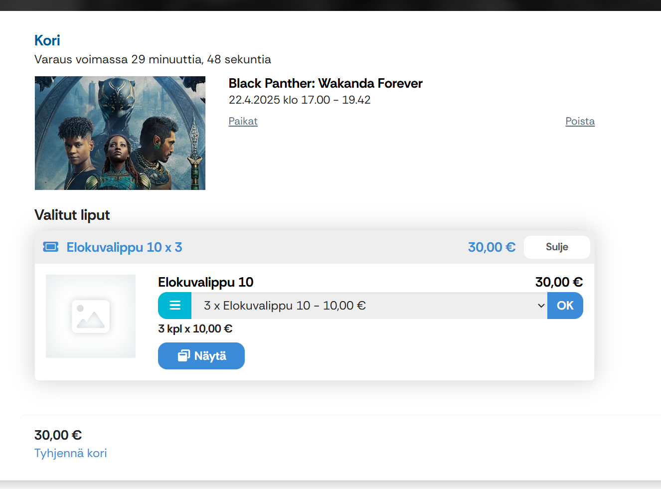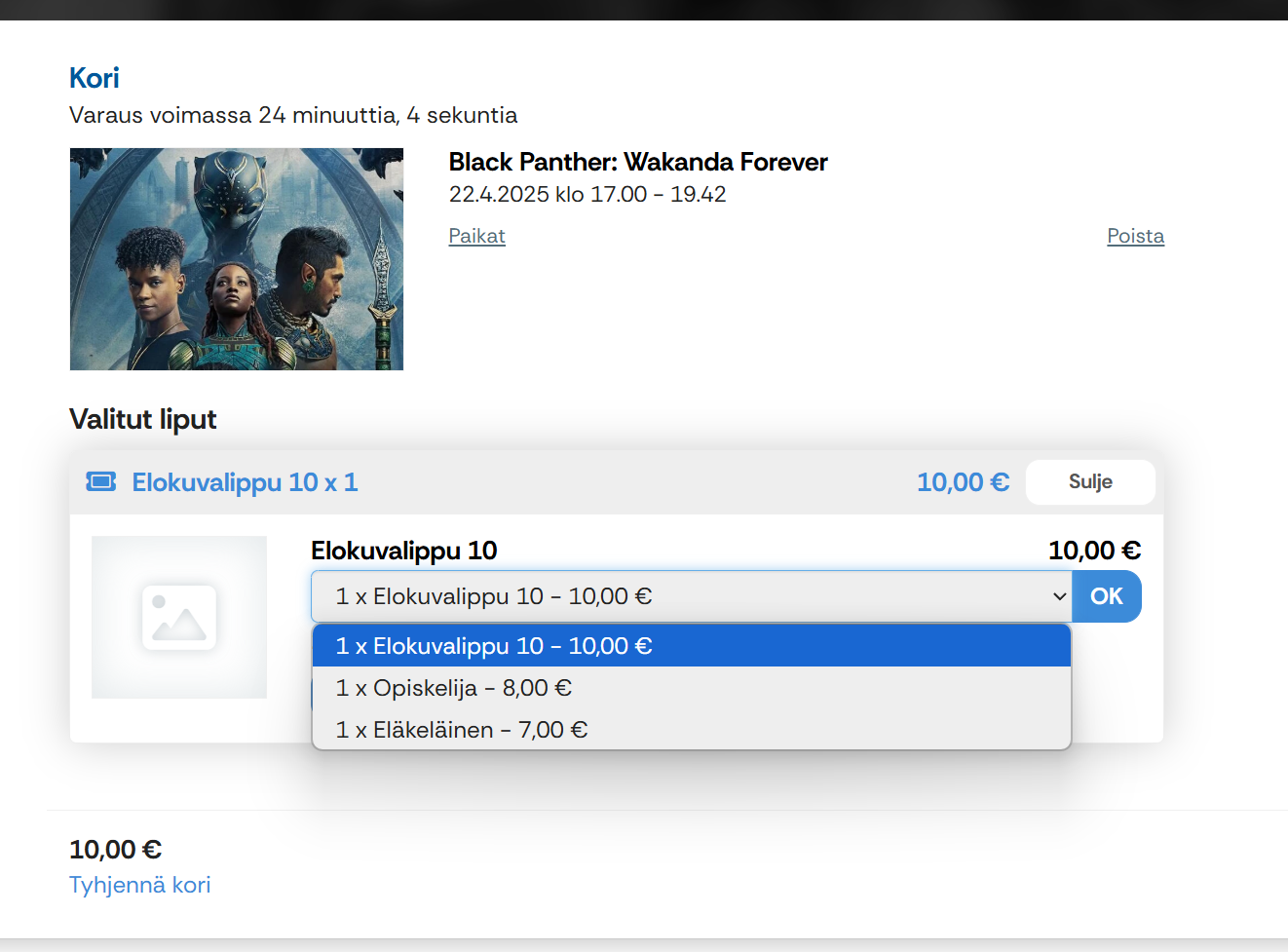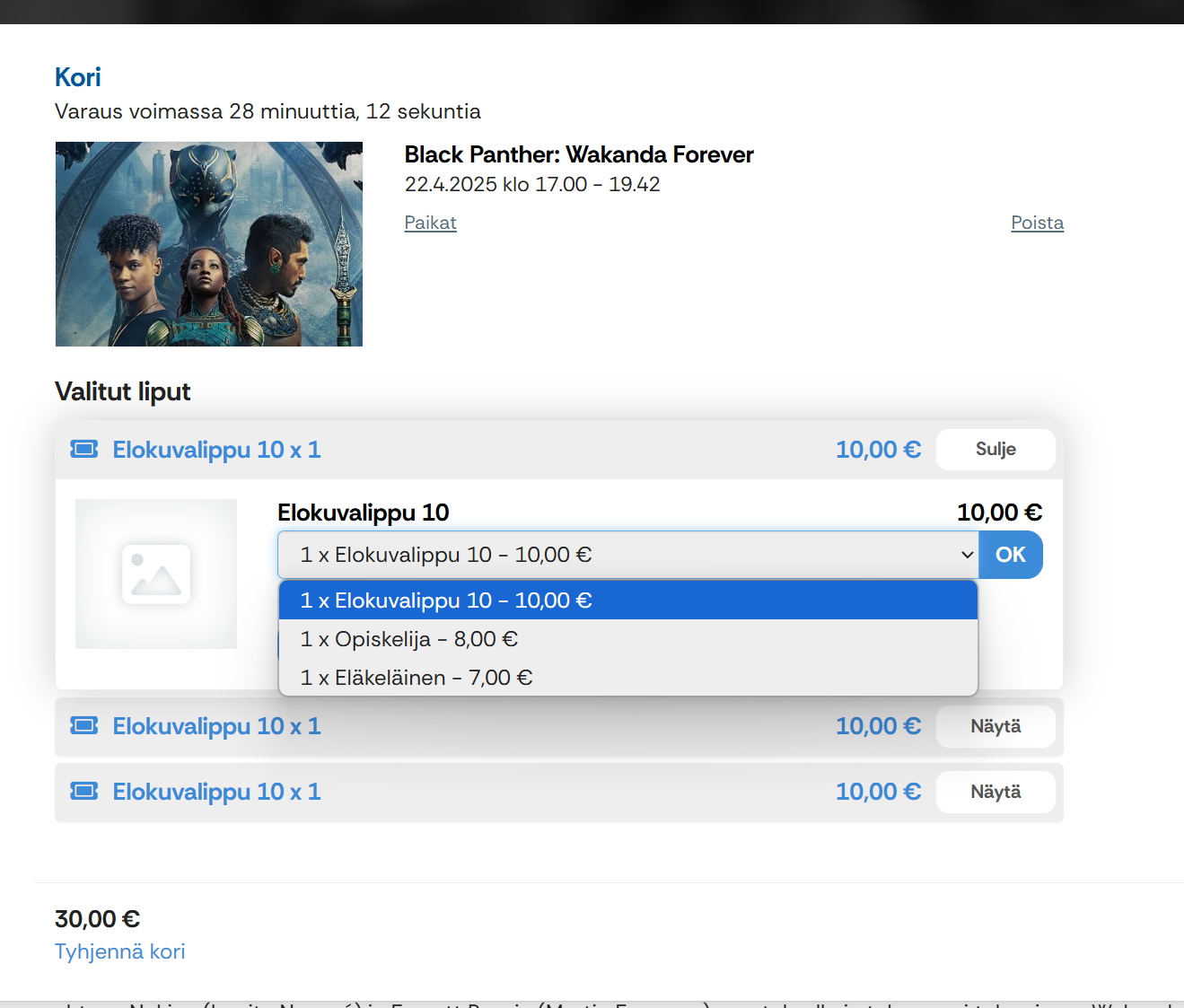 Elokuvien onlinemyynnissä esille eri lipputyypit tuodaan esille tuotesivulla. Valittujen lippujen vaihto toiseen tyyppii onnistuu ostoskorissa ja tilaussivulla.