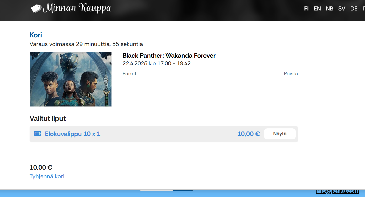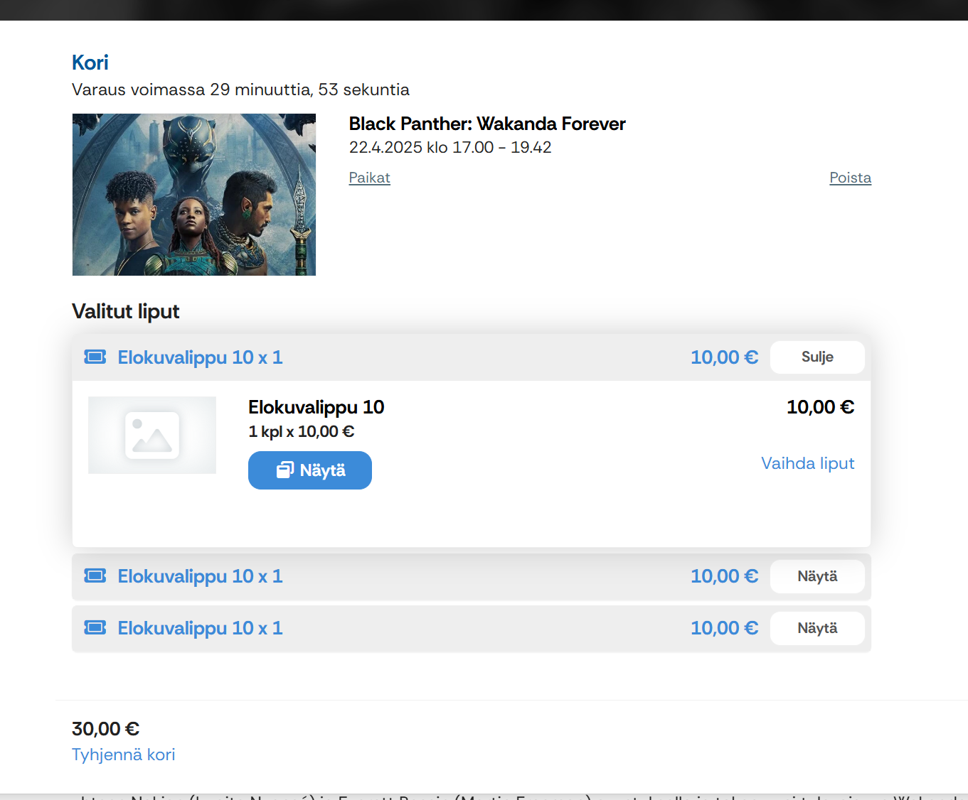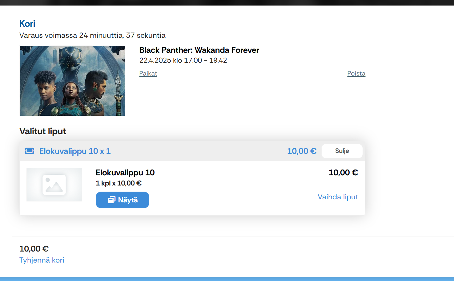Elokuvien onlinemyynnissä esille eri lipputyypit tuodaan esille tuotesivulla. Valittujen lippujen vaihto toiseen tyyppii onnistuu ostoskorissa ja tilaussivulla.