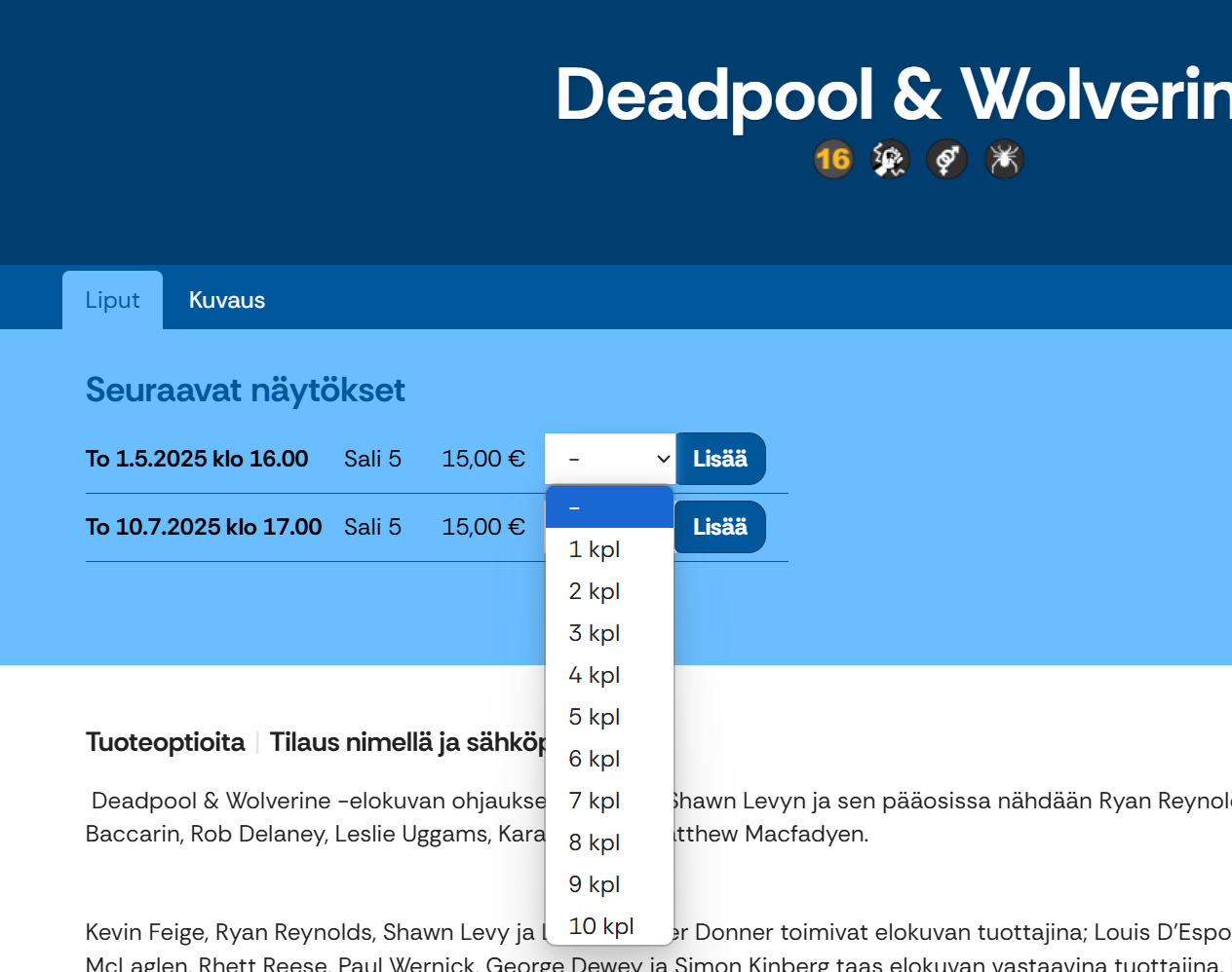Tämän jälkeen asiakas ei saa lisättyä ostoskoriin useampia tämän elokuvan näytöslippuja kuin mitä rajoitukseen on asetettuna. Rajoitus koskee kaikkia tämän elokuvan näytöksiä.