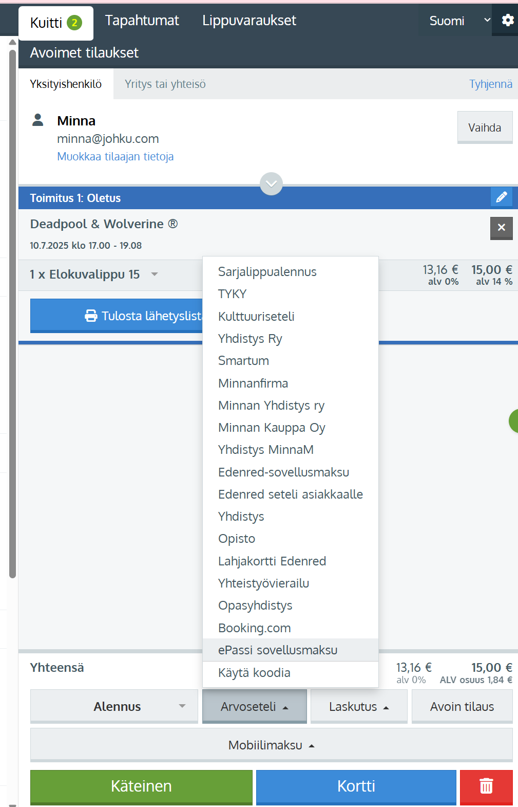 Jos asiakas haluaa maksaa Epassi- tms. etusovelluksella, sekä tilaus että maksu täytyy kirjata Johkuun manuaalisesti, sillä Johku ei kytkeyty sovelluksiin. Edulla tehty maksu kirjataan Johkuun käyttäen arvoseteliä.