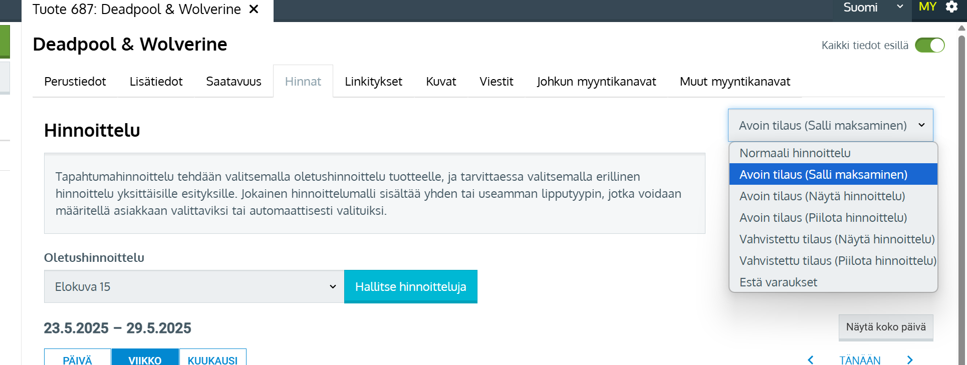 - Avoin tilaus (Näytä hinnoittelu) tai Avoin tilaus (Piilota hinnoittelu) mikäli haluat sallia elokuvalle VAIN lippuvaraukset. Tällä valinnalla verkkokaupassa elokuvan lippuja ei voi maksaa lainkaan, vain varata