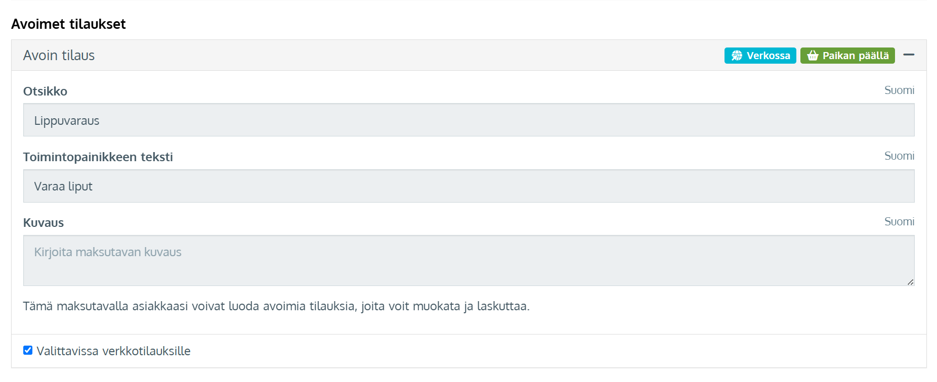 - Avoin tilaus (Salli maksaminen) mikäli haluat sallia sekä lippuvaraukset että lippujen suoran maksaminen