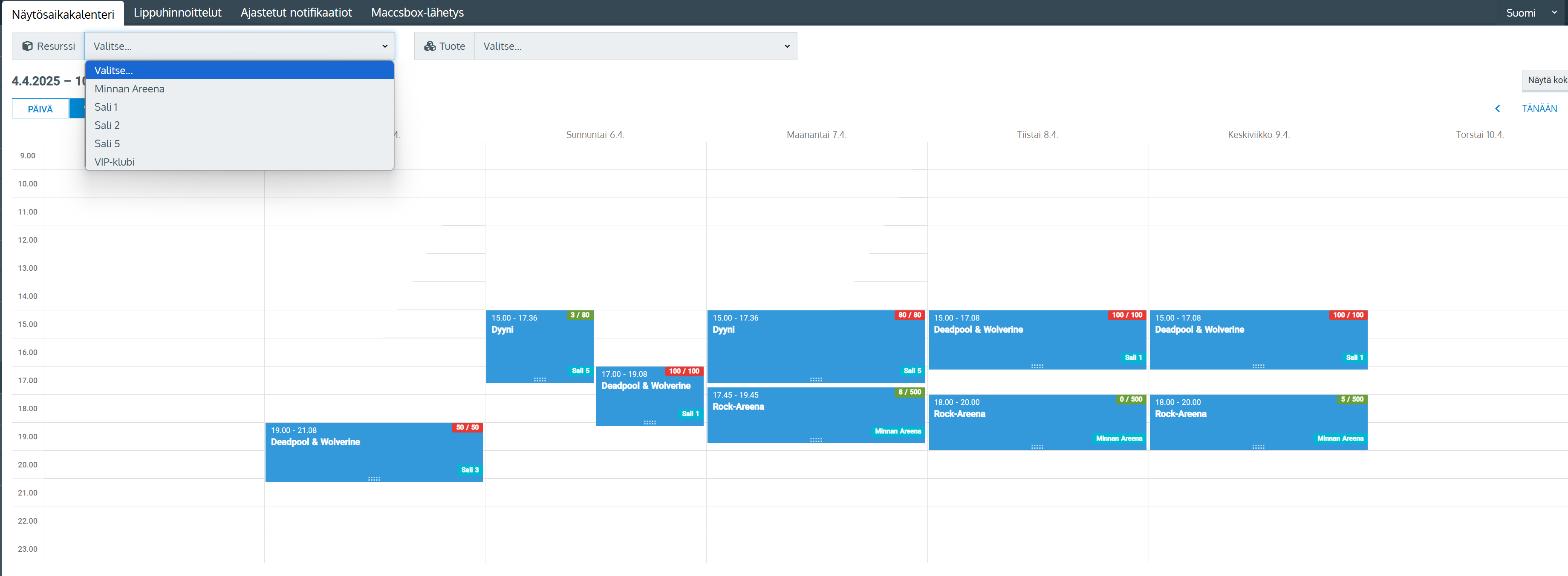 Näytösten luominen sekä tarkastella näytösten kapasiteetteja ja muita tietoja Näytöksen tiedot näytösaikakalenterissa.