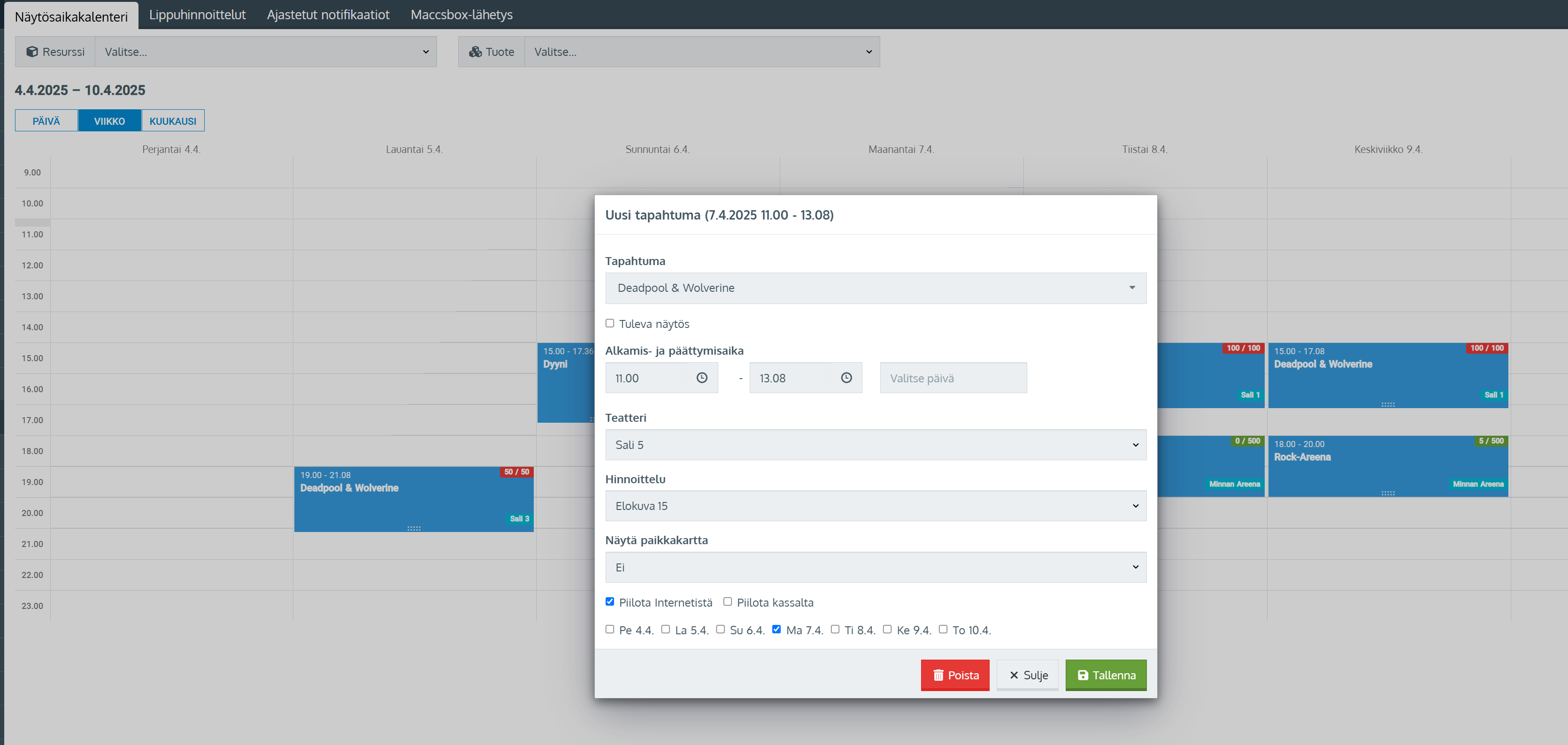 Voit asettaa näytökset joko elokuvan Hinnat-välilehdellä tai Näytösaikakalenteri-sivulla