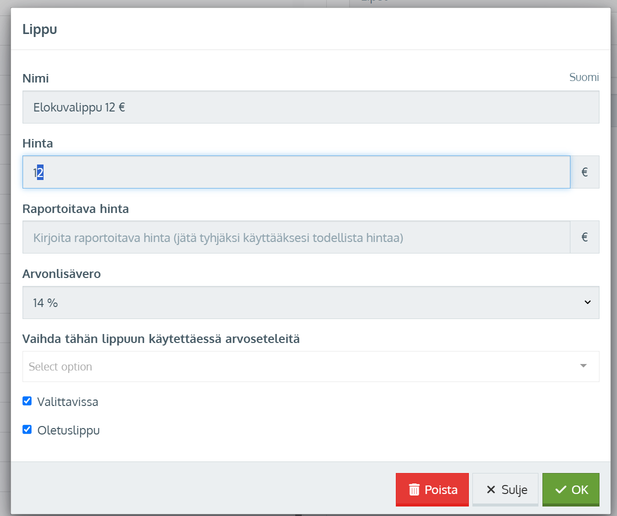 - Muuta tarvittaessa myös lipun nimi mikäli siinä on hinta mainittuna