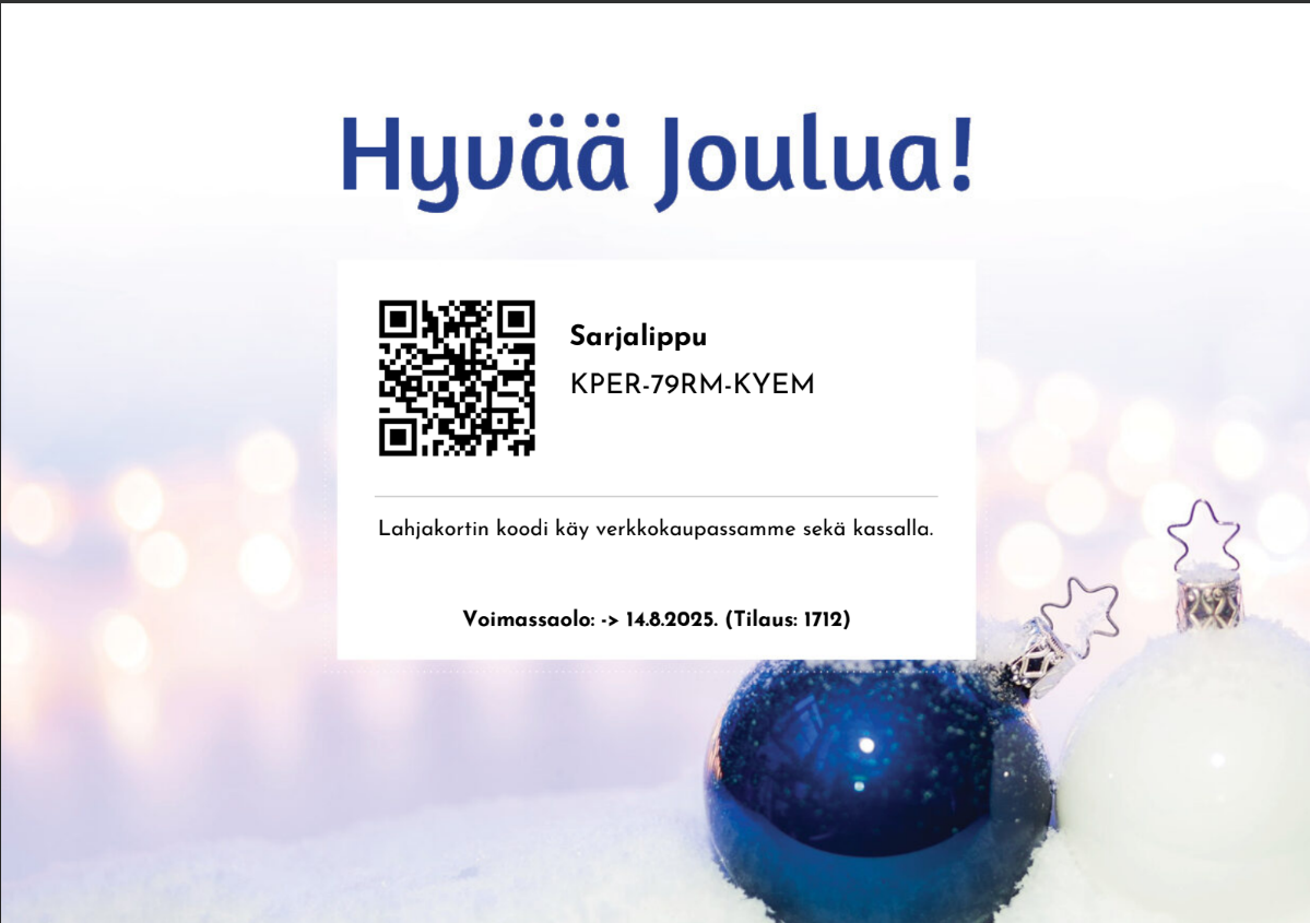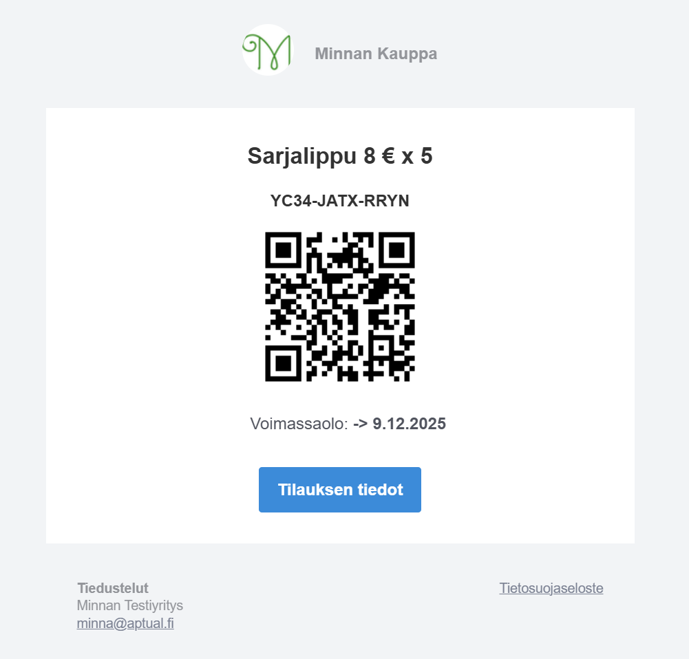 Sähköpostiin tuleva sekä paikan päällä tulostettava sarjalippu on vakiomuotoinen eikä sen asettelua voi muuttaa. Voit vaikuttaa vain nimeen; arvosetelin nimi tulee esille sarjalippuun ennen kooditietoja.