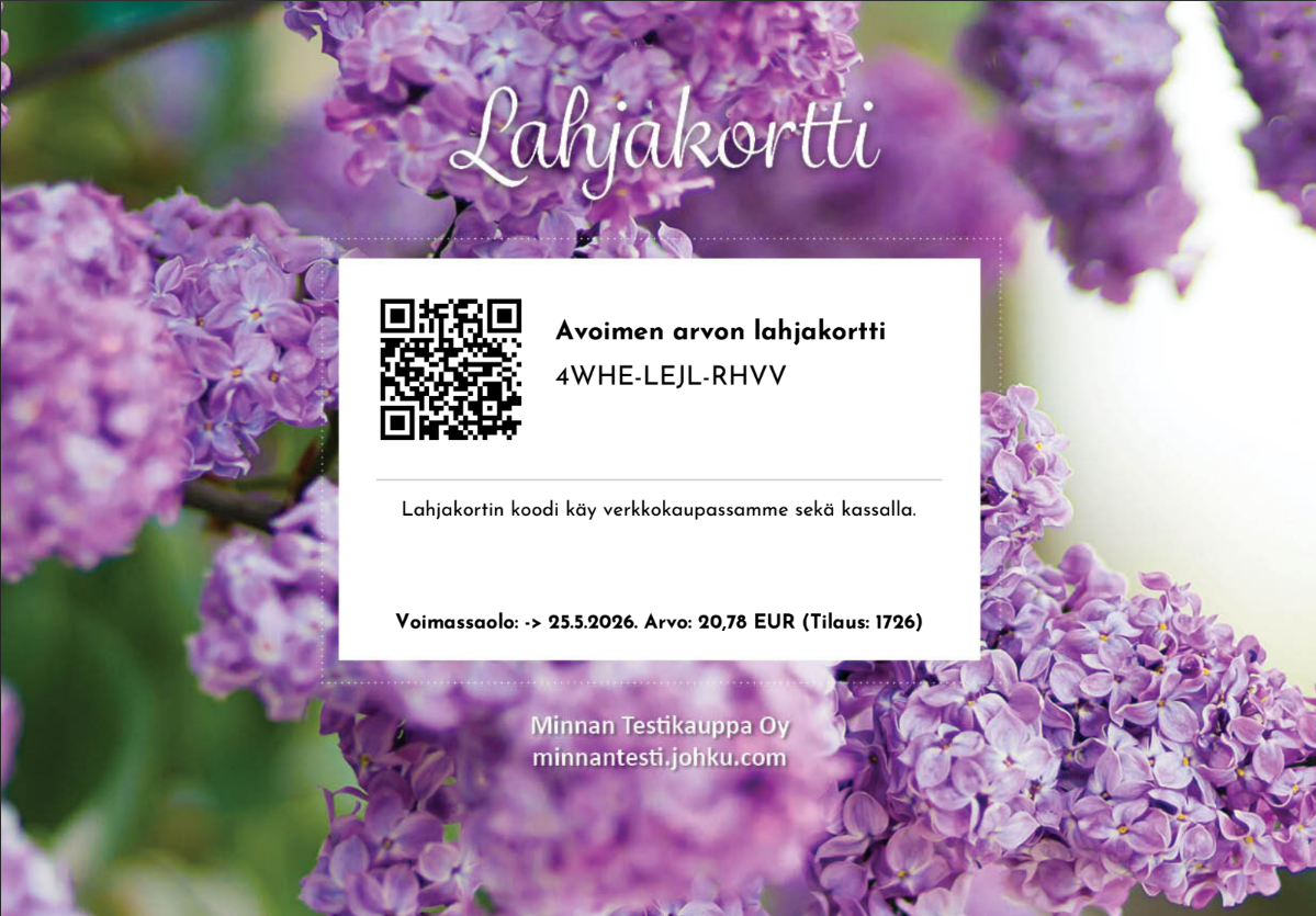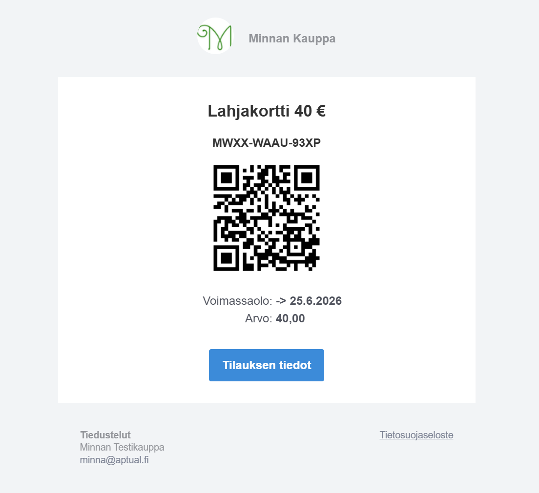 Sähköpostiin tuleva sekä paikan päällä tulostettava lahjakortti on vakiomuotoinen eikä sen asettelua voi muuttaa. Voit vaikuttaa vain nimeen; arvosetelin nimi tulee esille lahjakorttiin ennen kooditietoja.