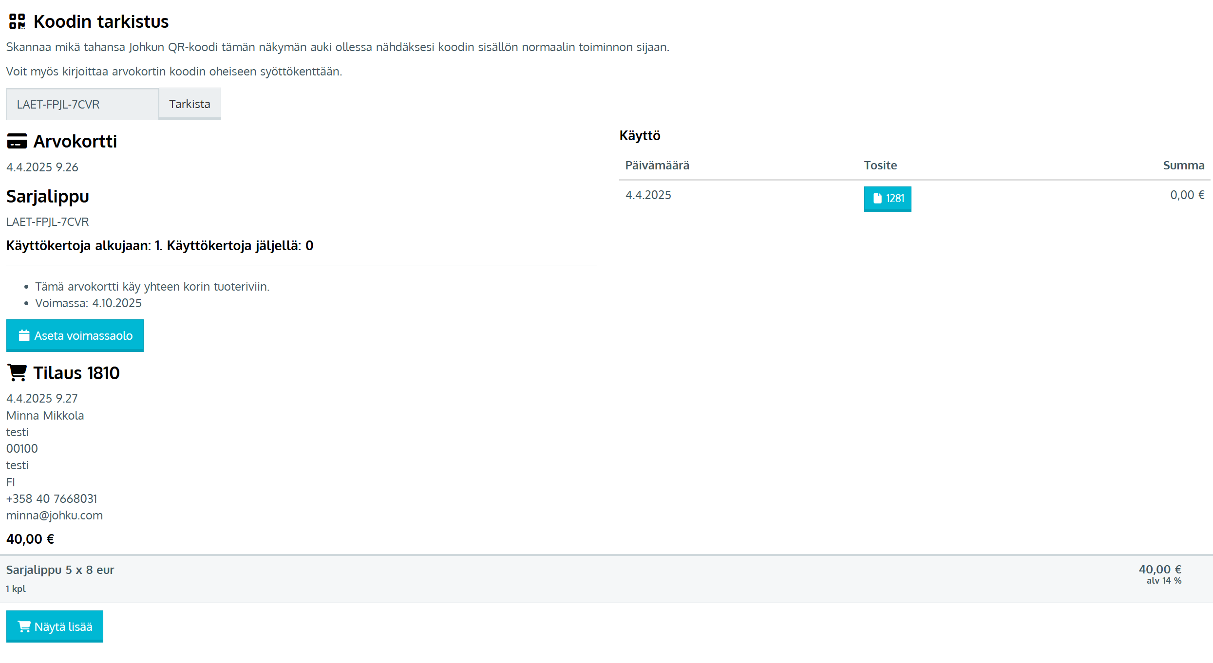 Koodin tarkistus -toiminnolla voit tarkistaa yksittäisen sarjalippu- tai lahjakorttikoodin tiedot; ostajan, voimassaoloajan, jäljellä olevan arvon (lahjakortti), käyttökertojen määrän (sarjalippu) sekä kaikki koodin käyttökerrat tositteittain eriteltynä.