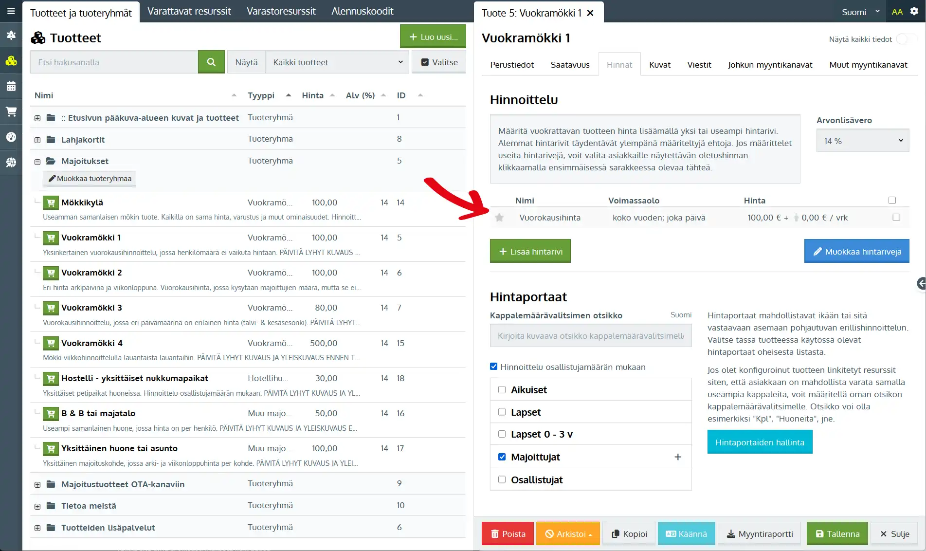 Muokkaa valitsemasi hinnoittelu vastaamaan haluamaasi. Tuotteella voi olla useampia hintarivejä erilaisin ehdoin.