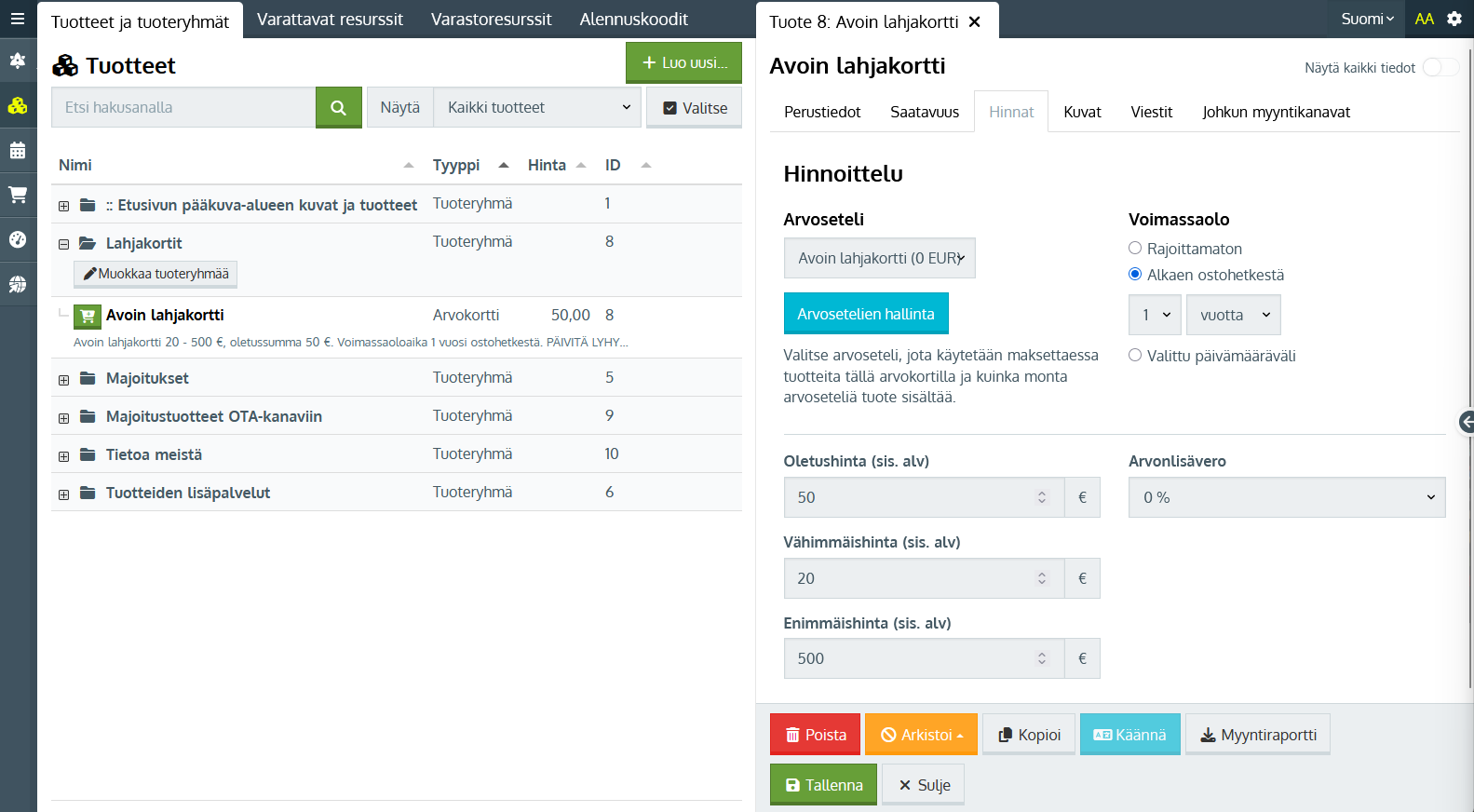 Lahjakortissa on avoin arvo, eli asiakas voi valita haluamansa arvon 20 - 500 € väliltä. Oletusarvo on 50 €. Näitä voit muokata tuotteen hinnat-välilehdellä.