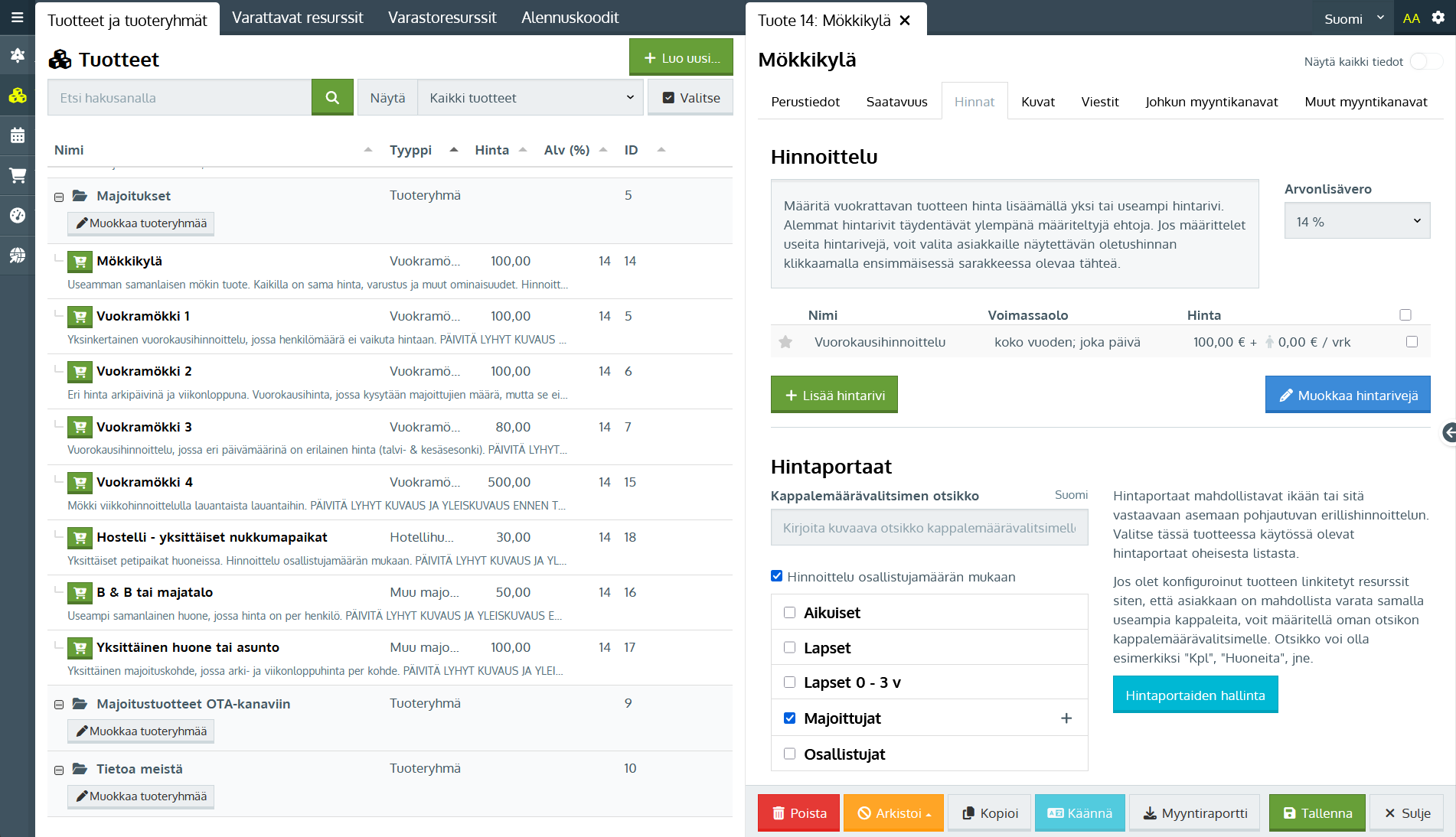 Useamman samanlaisen mökin tuote. Kaikilla on sama hinta, varustus ja muut ominaisuudet. Hinnoitteluna vuorokausihinnoittelu, osallistujamäärä ei vaikuta hintaan. Hinnoittelu on osallistujamäärän mukaan, mutta majoittujien määrä ei vaikuta hintaan. Majoittujien määrä tarvitaan kuitenkin esimerkiksi tilastokeskuksen raportointiin.