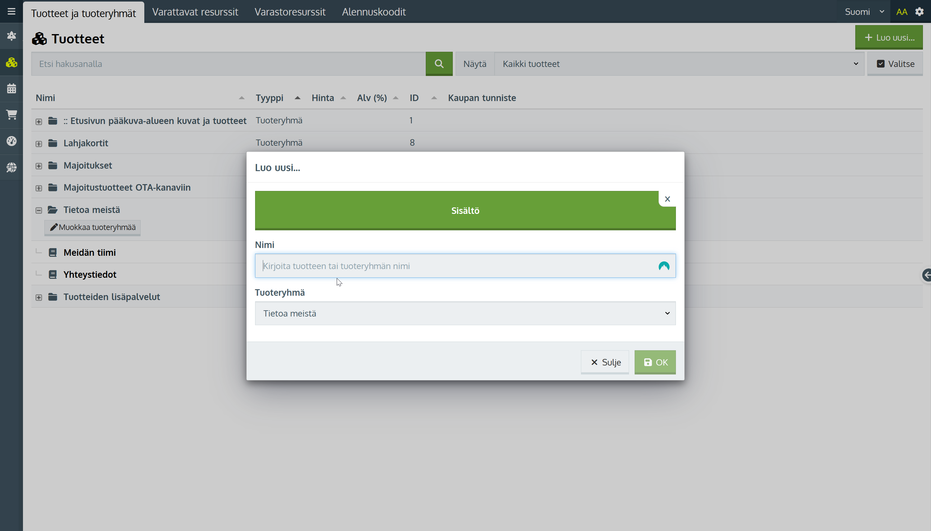 Päivitä näihin nimi, lyhyt kuvaus, yleiskuvaus ja kuvat kuten tuotteisiin. Halutessasi voit luoda uusia sisältöjä. Klikkaa Tuotteet-osiossa Luo uusi ja valitse Sisältö. Luo sisältö Tietoa meistä -tuoteryhmään.