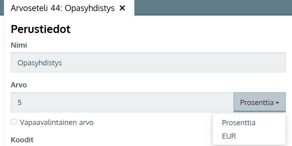 - Aseta Arvo-kohtaan prosentuaalinen tai euromääräinen arvo , jonka arvosetelikoodi kattaa tilauksen loppusummasta. Vapaavalintainen arvo ei ole käytettävissä arvosetelikoodeilla