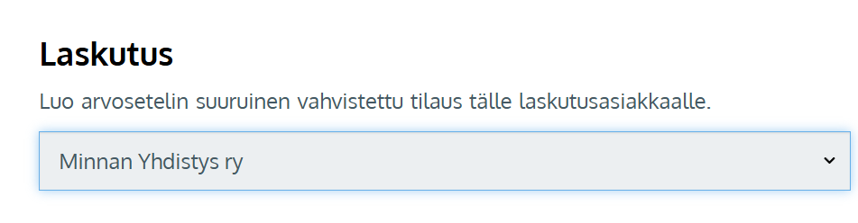 - Jos yritys tai yhdistys maksaa käytetyt arvosetelikoodit, valitse se Laskutus-kohtaan alasvetovalikosta . Jos yritystietoja ei vielä ole, luo ensin se Asiakkaat-sivun Laskutusasiakkaat-välilehdellä