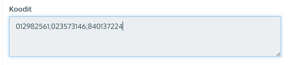 - Syötä Koodit-kohtaan kaikki koodit jotka haluat kytkeä tähän arvoseteliin . Koodi voi olla vaikka jäsennumero