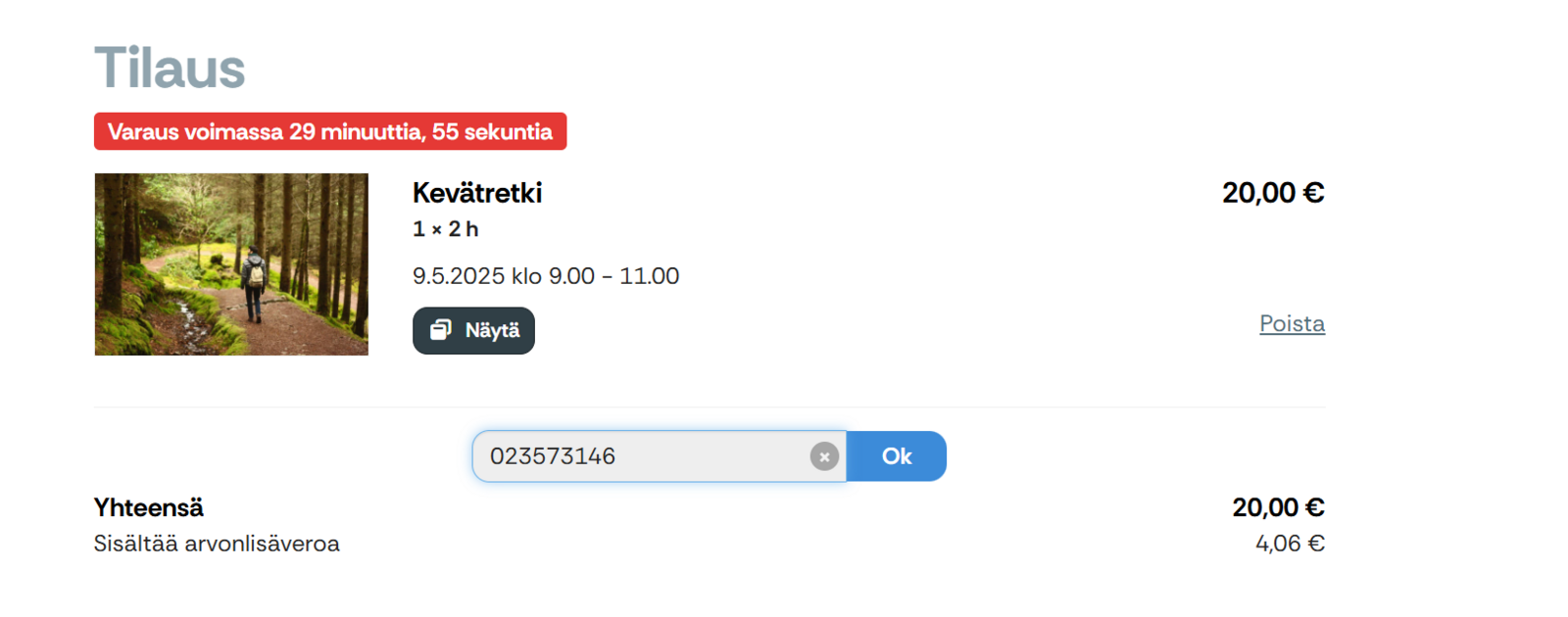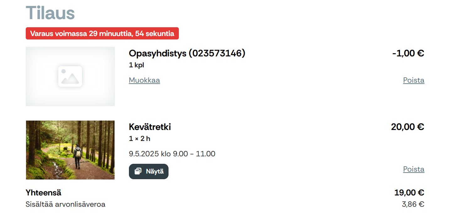 - Asiakas syöttää tilaajatietonsa ja maksaa onlinemaksulla tilauksen loppuosan. Jos koodi kattaa koko tilauksen summan, tilaus viimeistellään ilman maksua