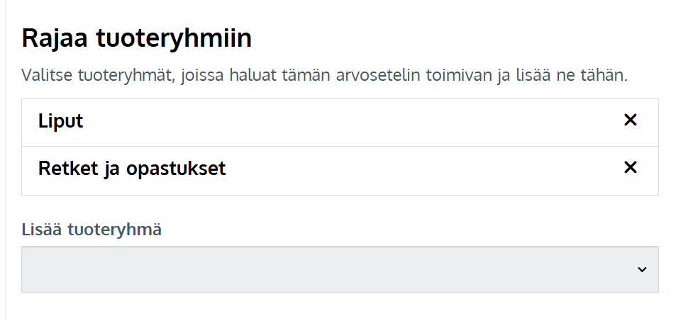 - Rajaa arvosetelikoodien käyttö halutessasi tiettyihin kaupan tuotteisiin valitsemalla tuoteryhmät vuorotellen alasvetovalikosta Rajaa tuoteryhmiin -kohdassa. Tämän arvosetelin koodeja voi silloin käyttää vain mikäli asiakkaan onlinetilauksella on rajaukseen valittujen tuoteryhmien tuotteita