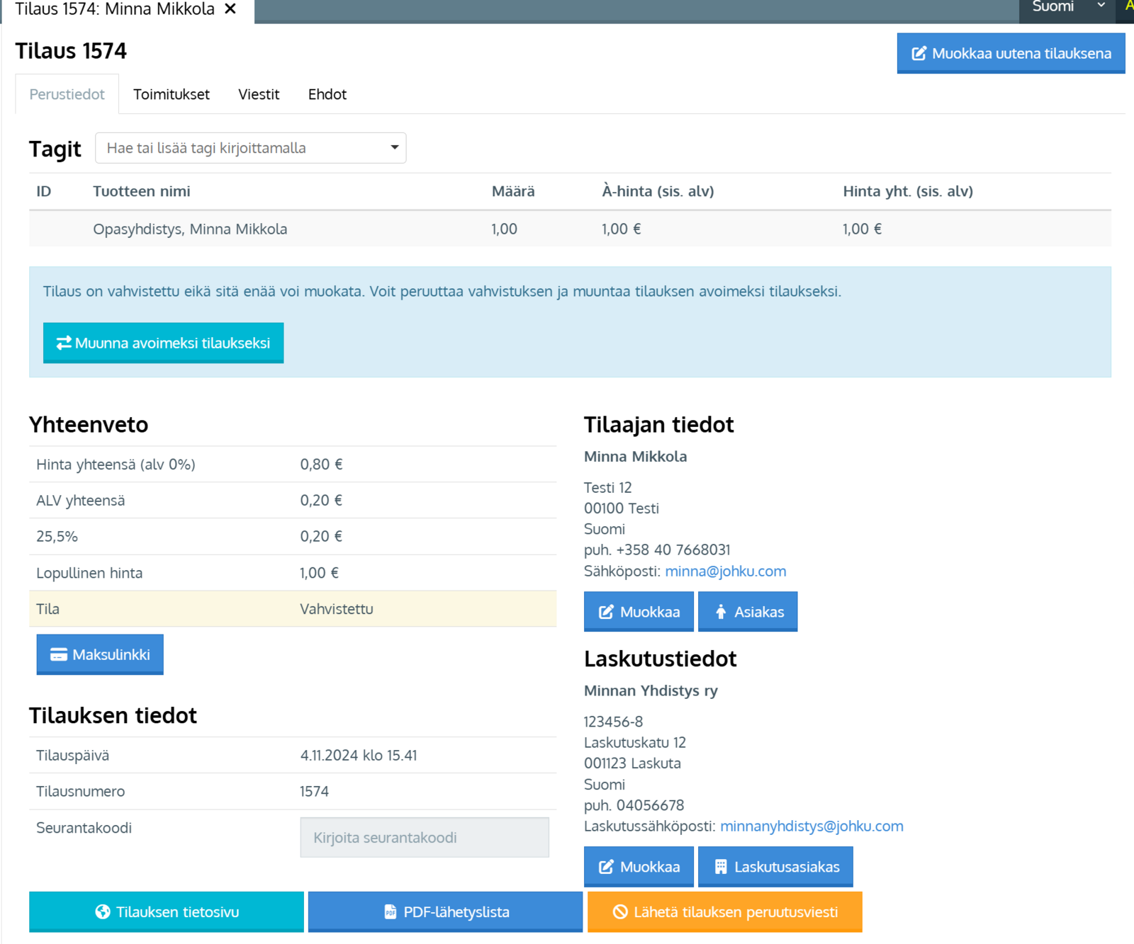 - Tilauksella on tilaajana koodin käyttänyt asiakas ja laskutustietoina yritys