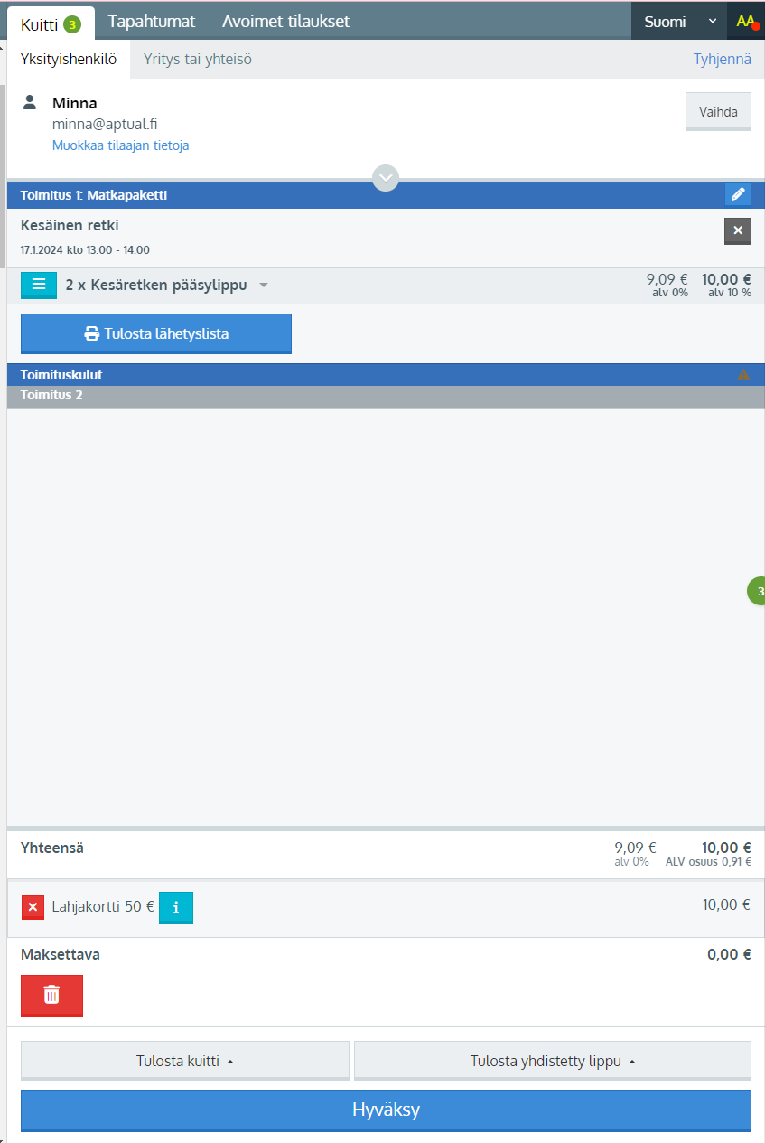 • Lopuksi tehdään kuitin sekä mahdollisten lippujen tulostus/sähköpostilähetysvalinnat sekä klikataan Hyväksy