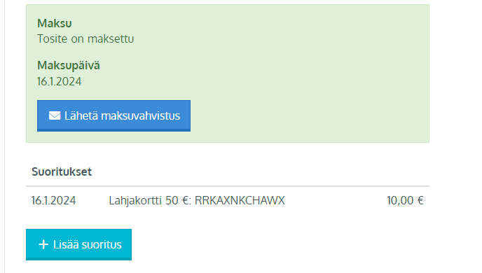 Tilauksella käytetty arvokorttikoodi näkyy tositteen Suoritukset-kohdassa: