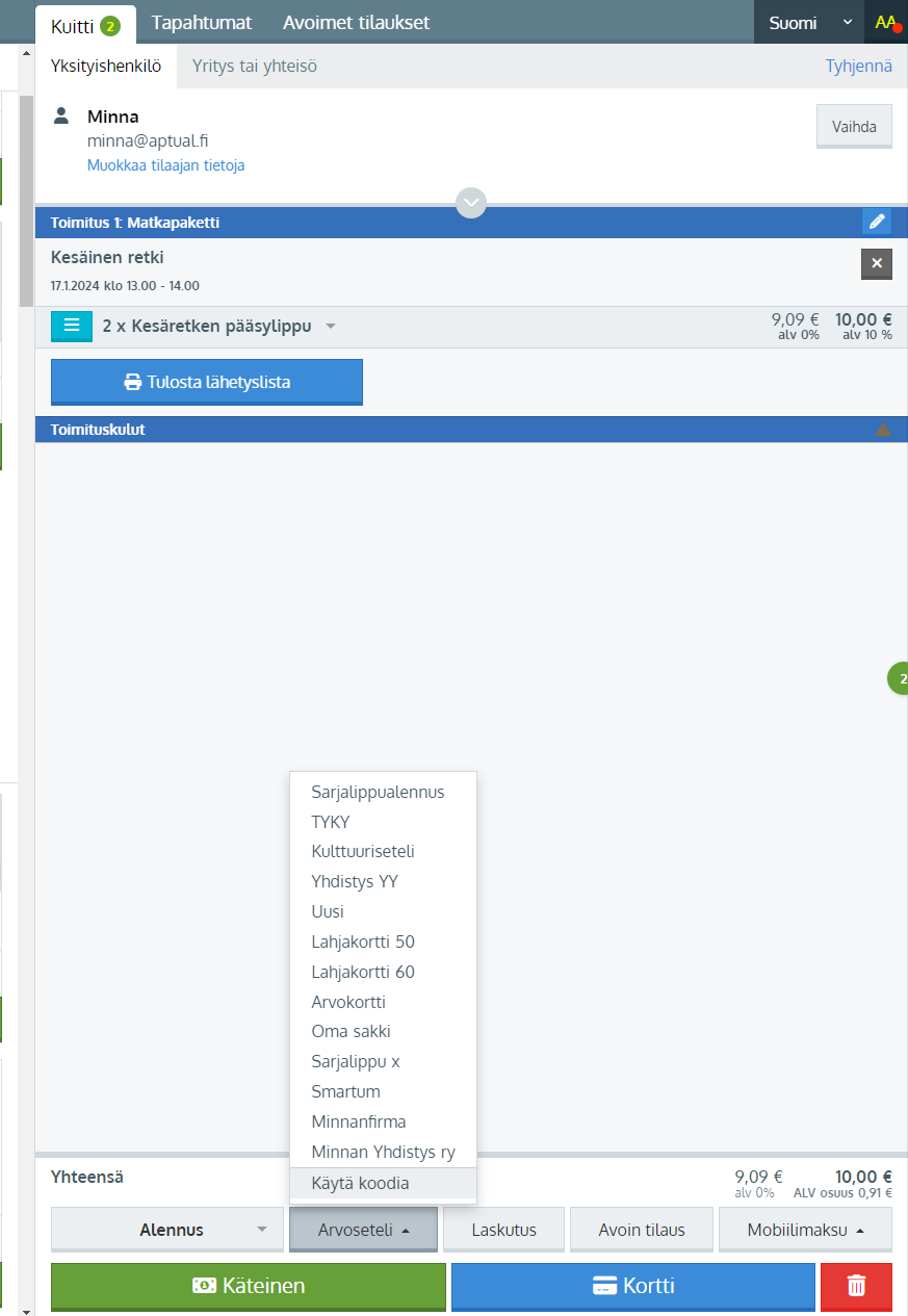 • Jos qr-koodilukijaa ei ole käytössä, arvokortin tekstimuotoinen voidaan lisätä kassalla ja tilauseditorissa Arvosetelit-painikkeen alta löytyvällä Käytä koodia -toiminnolla