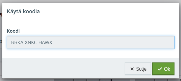 • Käytä koodia -kohdan klikkaaminen tuo esille koodinsyöttökentän. Syötä tekstikoodi kenttään ja klikkaa OK