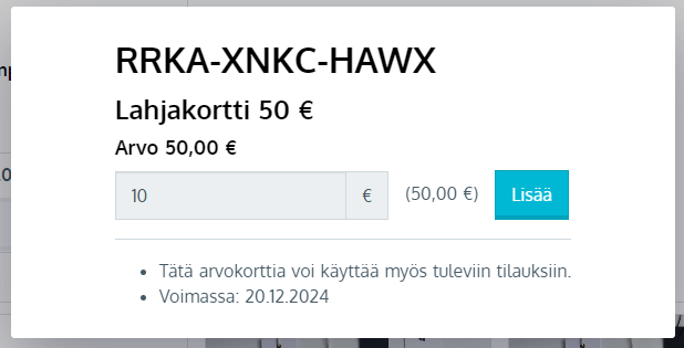 • Arvokorttikoodi kuittaa asetetun summan verran tilauksesta