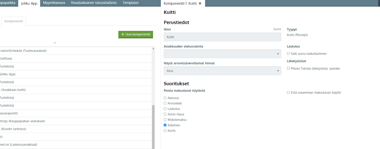 - Klikkaa listalla nimeä Kuitti tai Tilauseditori, sen mukaan mistä haluat kytkeä käteisen pois