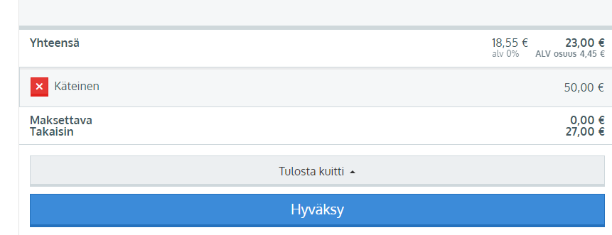 Käteismaksu sisältyy Johkun kassatoimintojen ja ylläpidon maksutapoihin ja on oletuksena valmiina käytettävissä kassakuitilla ja tilauseditorissa. Käteismaksua käytetään, kun asiakas maksaa käteisellä paikan päällä.