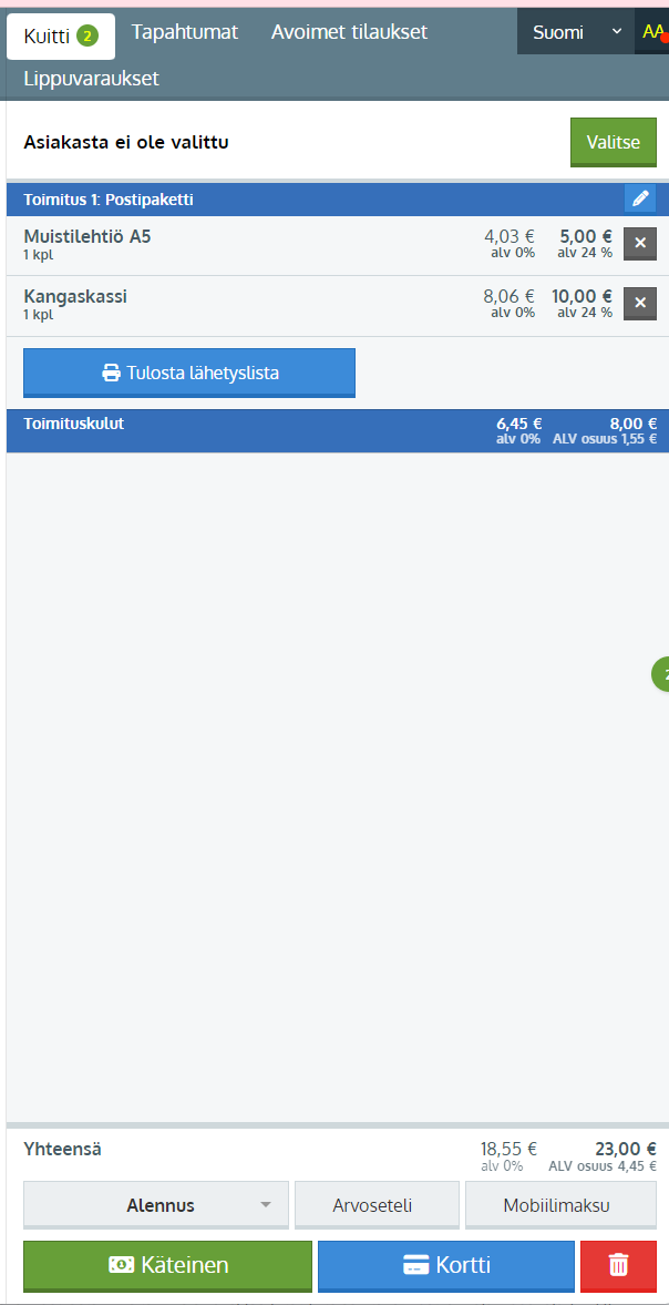 - Klikkaa kassalla halutut tuotteet kuitille tai tilauseditorin Lisää tuote -napilla