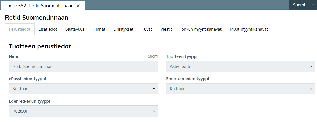 - Klikkaa lippu-tyypin suotteen nimeä listalla jolloin se avautuu tuote-editoriin muokattavaksi