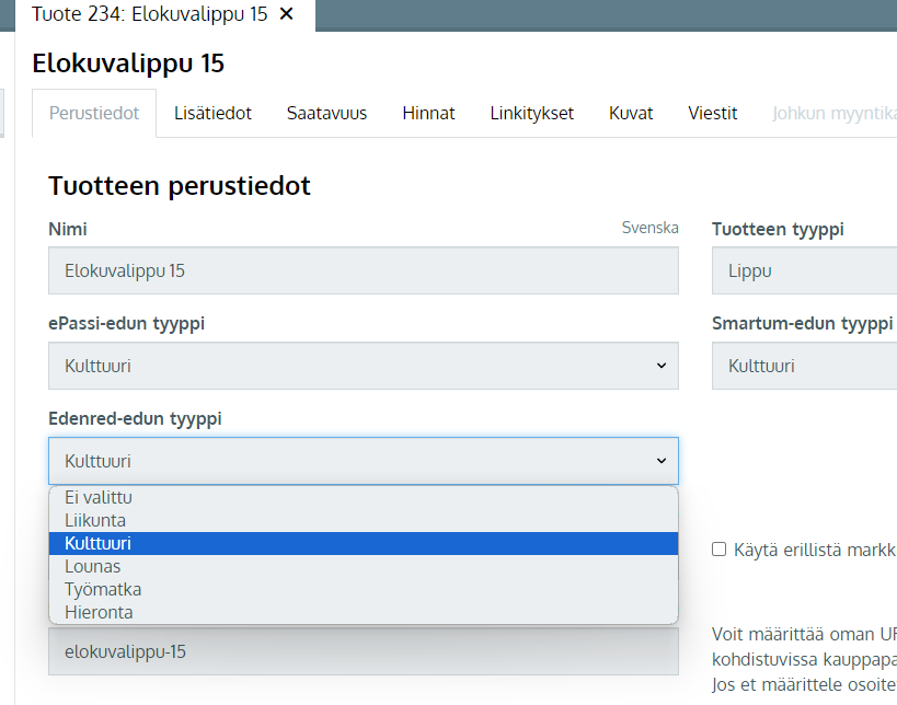 - Valitse tuotteen Perustiedot-välilehdellä Edenred-edun tyyppi -alasvetovalikosta etu