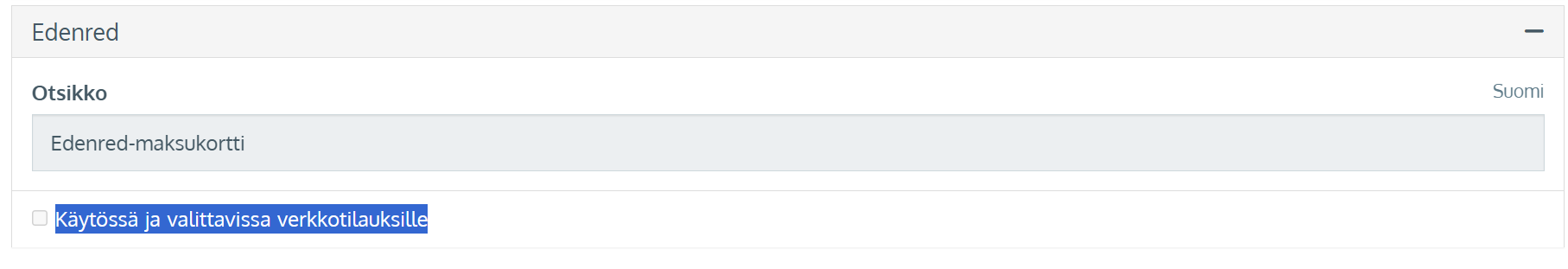 - Klikkaa Edenred-kohta auki ja aseta maksutavalle otsikko. Huomioi, että otsikko on kieliversiokohtainen