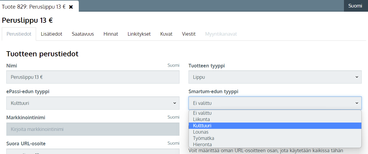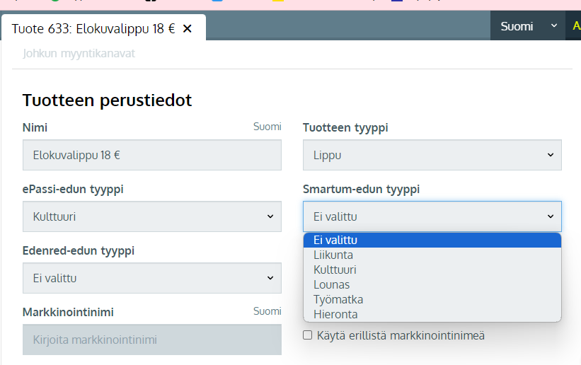 Kun Smartum-verkkomaksu on kytketty käyttöön, tulee tuotesivujen Perustiedot-välilehdelle esille kohta Smartum-edun tyyppi.