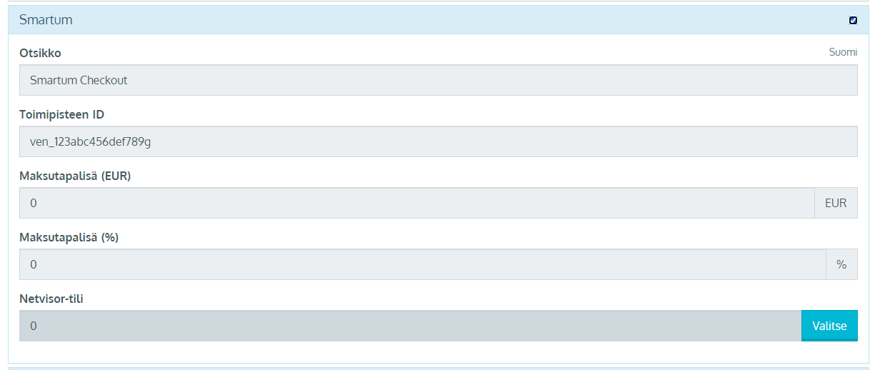 - Jos Johku-kaupassasi on käytössä Netvisor-integraatio, voit valita halutun Netvisor-tilin Smartum-maksutavalle