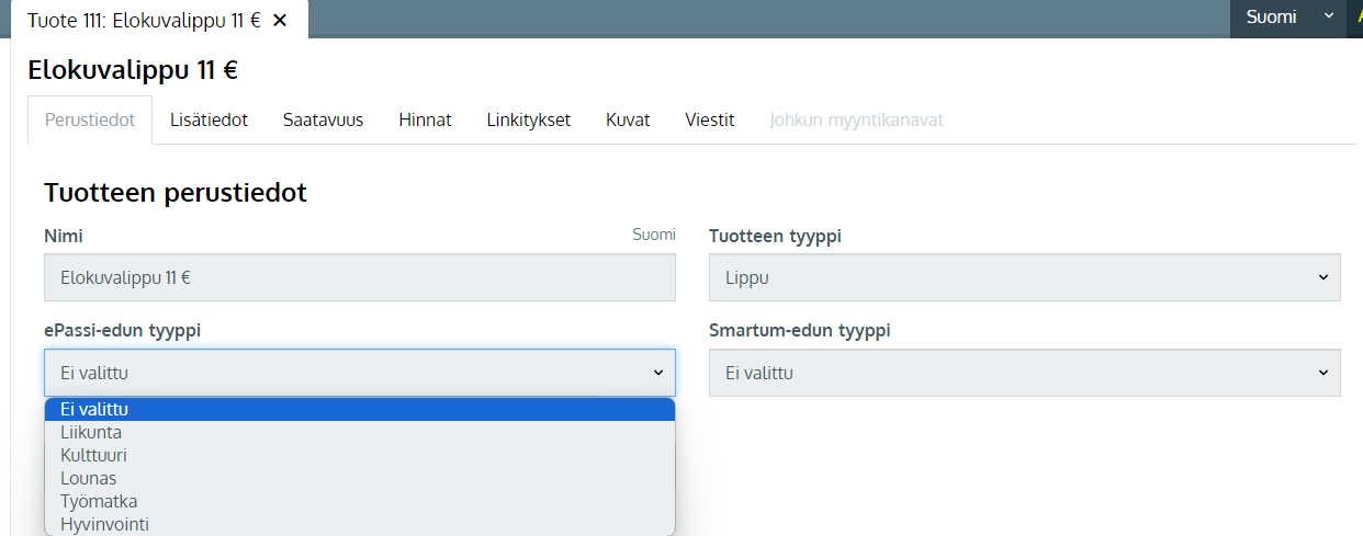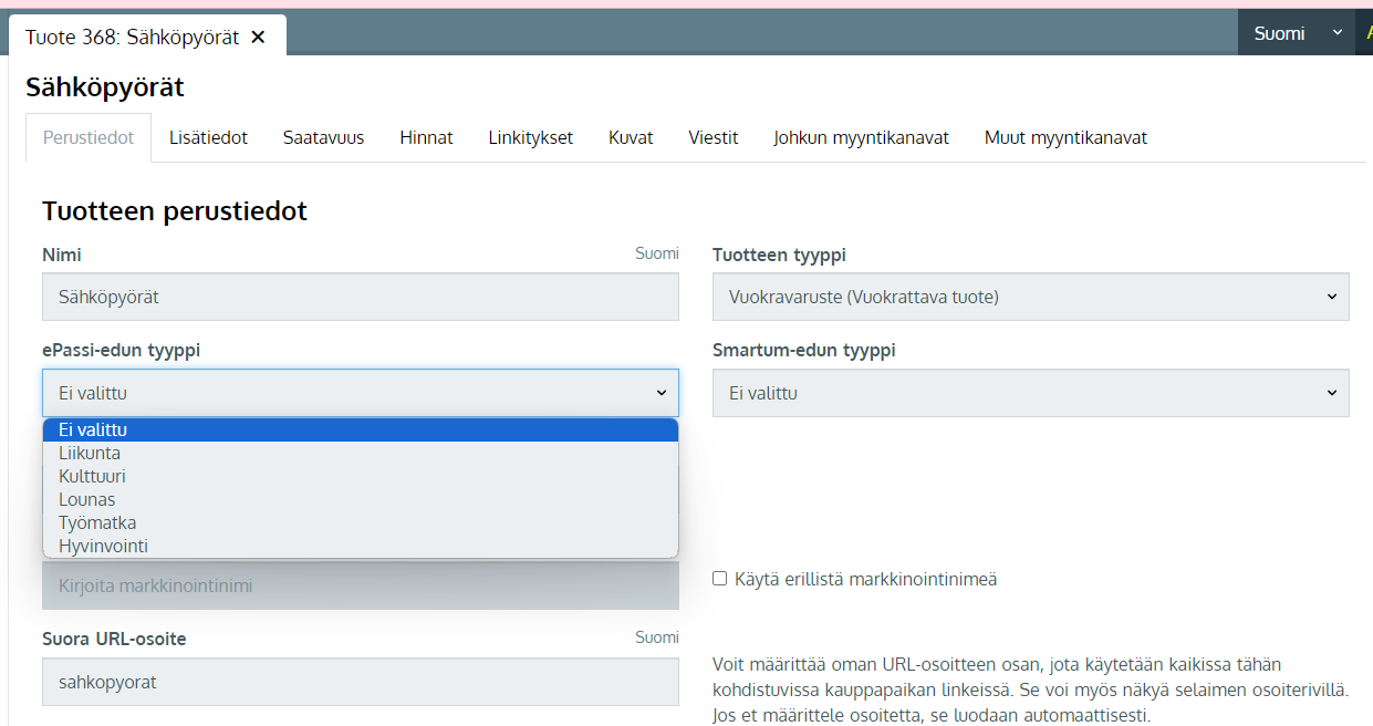 Kun ePassi-maksutapa on kytketty edellisessä kohdassa mainitulla tavalla käyttöön, tulee tuotesivujen Perustiedot-välilehdelle esille kohta ePassi-edun tyyppi.