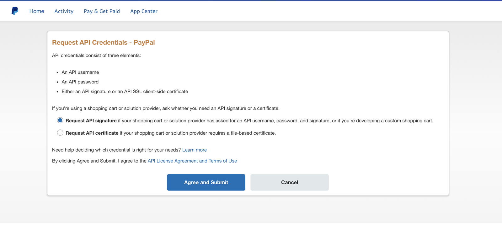 - Valitse **Request API signature **-vaihtoehto ja klikkaa Agree and Submit