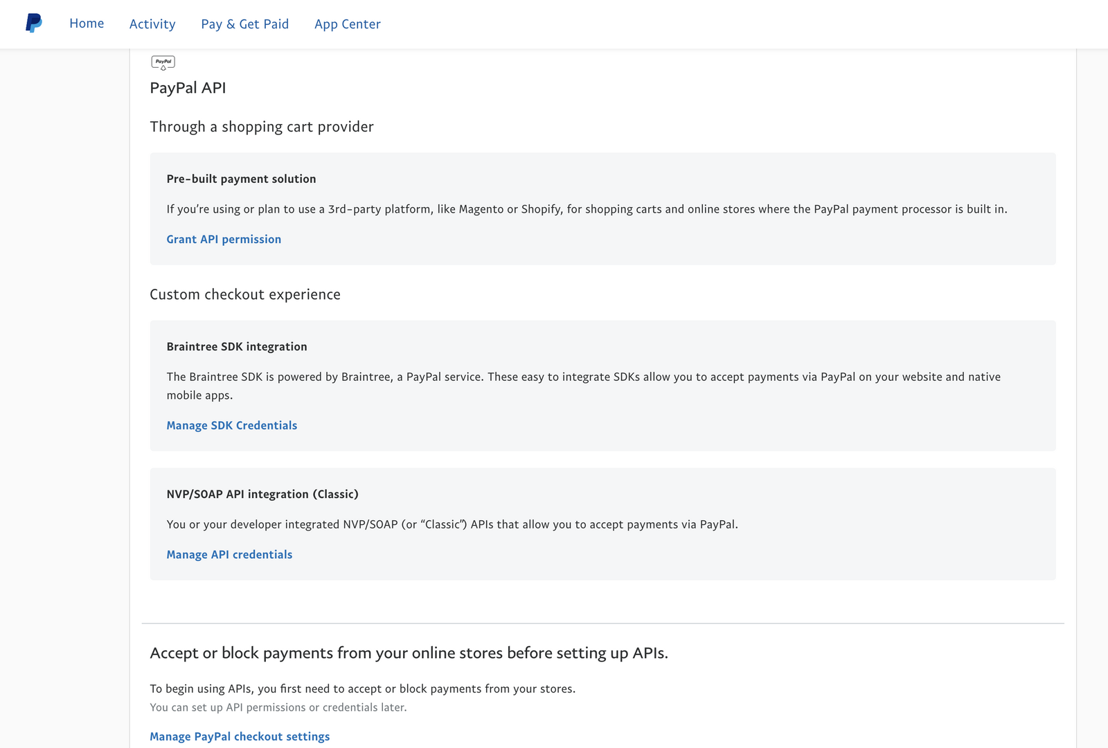 - Klikkaa NVP/SOAP API integration (Classic) -kohdasta Manage API Credentials