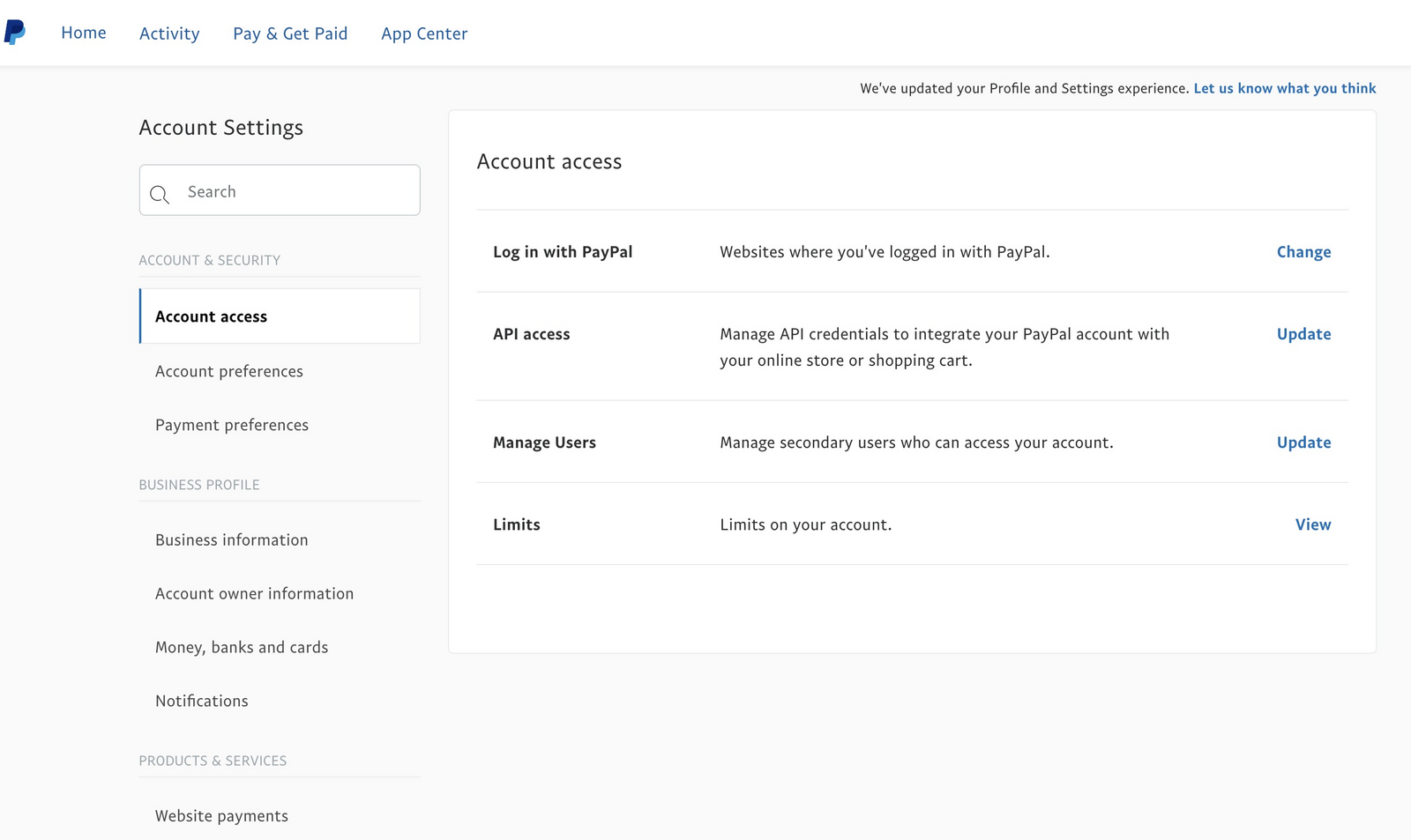 - Mene osoitteeseen: https://www.paypal.com/businessmanage/account/accountAccess