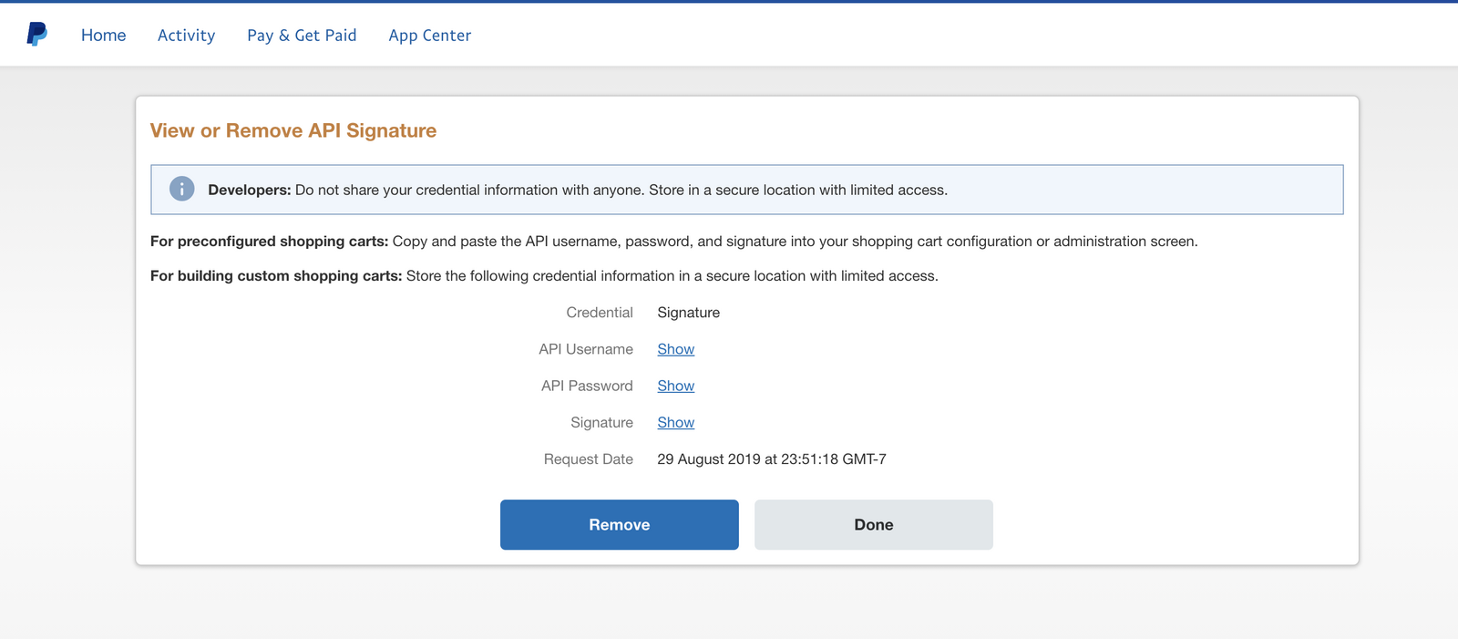- Klikkaa API Username, API Password ja Signature -kohdista Show, jotta saat tunnukset esille. Kopioi ne.